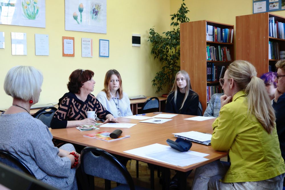 Pani Ewa słynie z odkrywania młodych talentów, dlatego w spotkaniu uczestniczyli wybrani uczniowie naszej szkoły, którzy, podobnie jak zaproszony gość, piszą teksty poetyckie, są instrumentalistami lub (jak się okazało w trakcie warsztatów)… artystami plastykami. Spotkanie miało charakter praktyczny. Pani Ewa, jako autorka pięknego przeboju, stworzonego specjalnie na uroczystość 70-lecia naszej szkoły, podzieliła się wspomnieniami z kulisów powstawania tego tekstu. Mieliśmy okazję przypomnieć sobie utwór dzięki archiwalnym nagraniom, a następnie wysłuchać wspomnień dotyczących procesu twórczego. Pani Ewa wykonała również, przy akompaniamencie gitary, inny swój przebój, zatytułowany „Pocztówka ze Stargardu”.