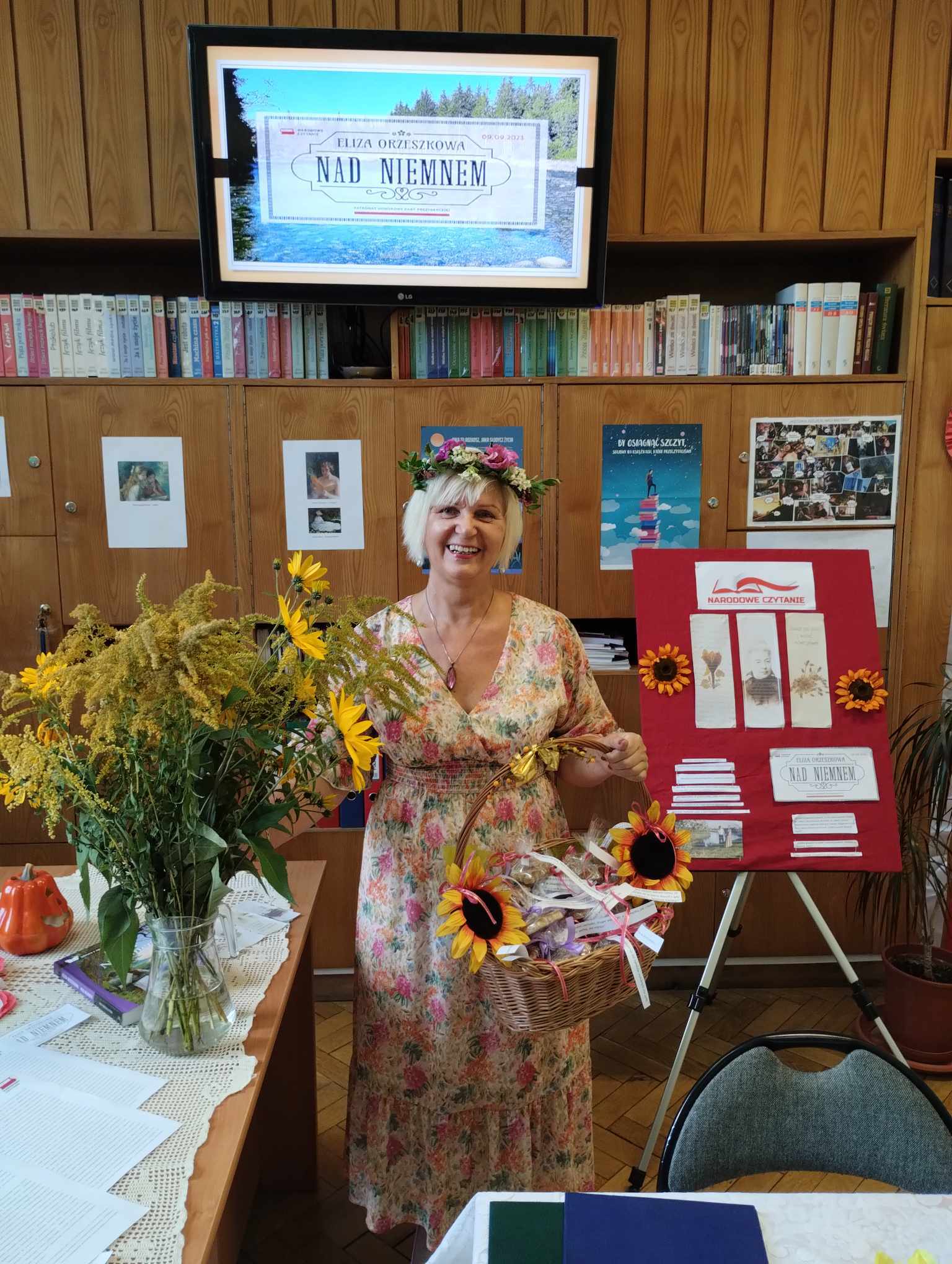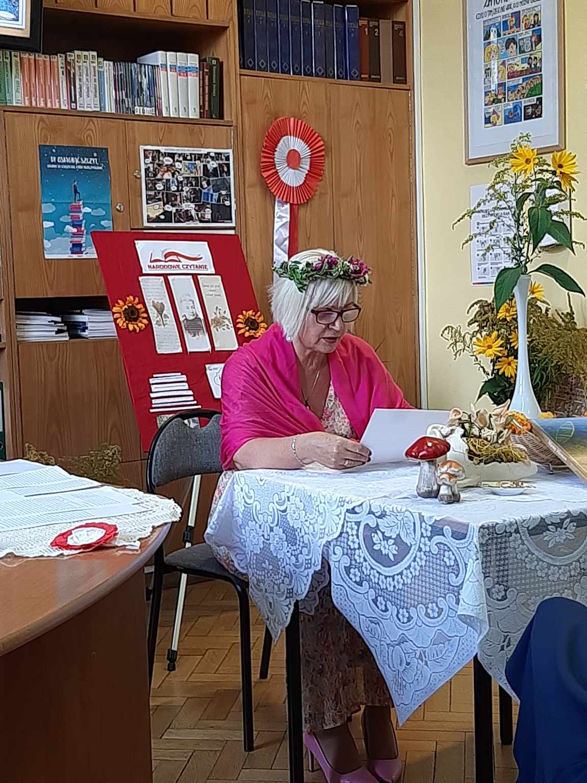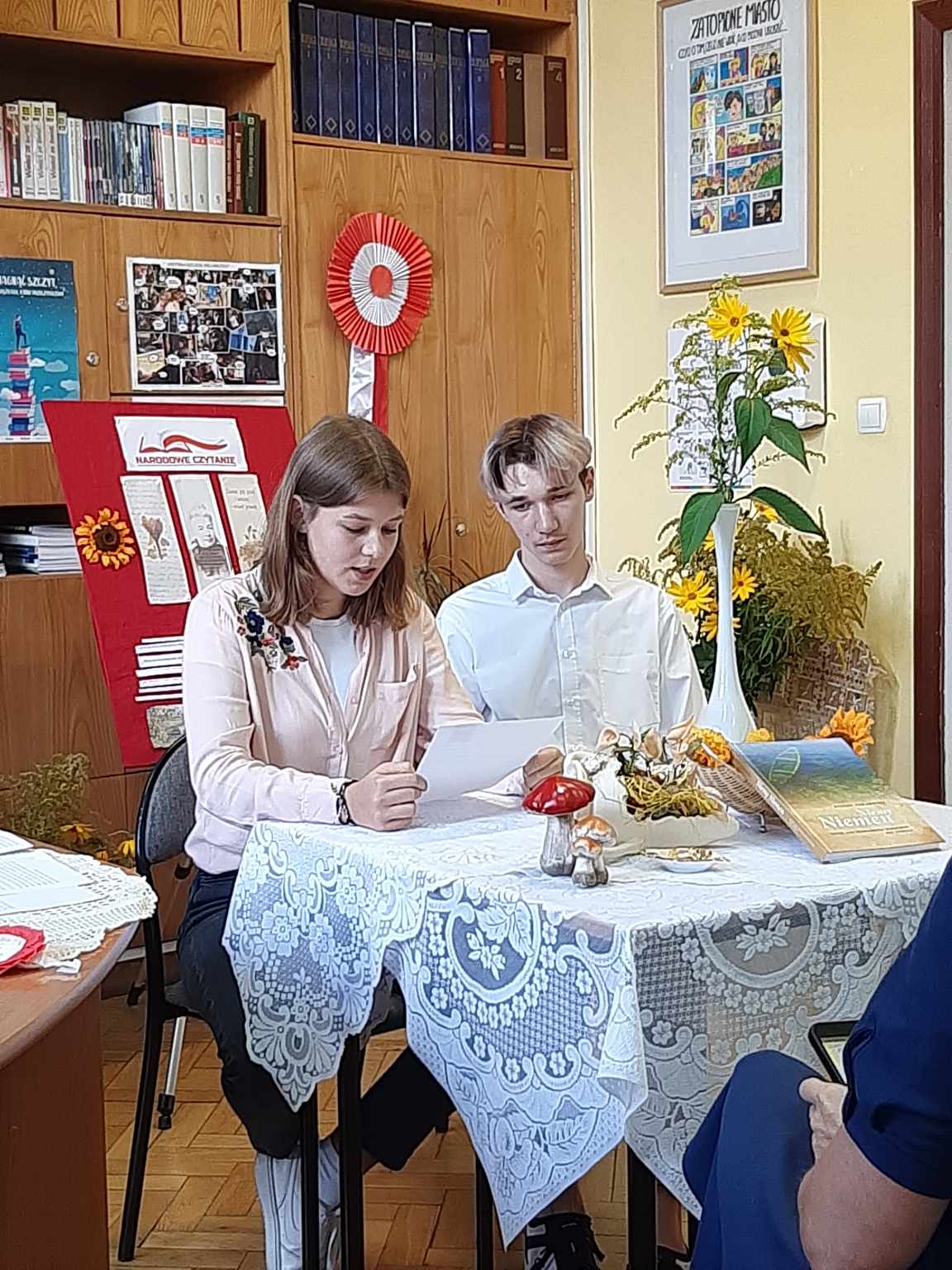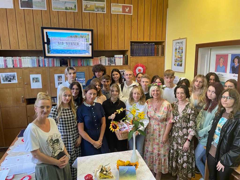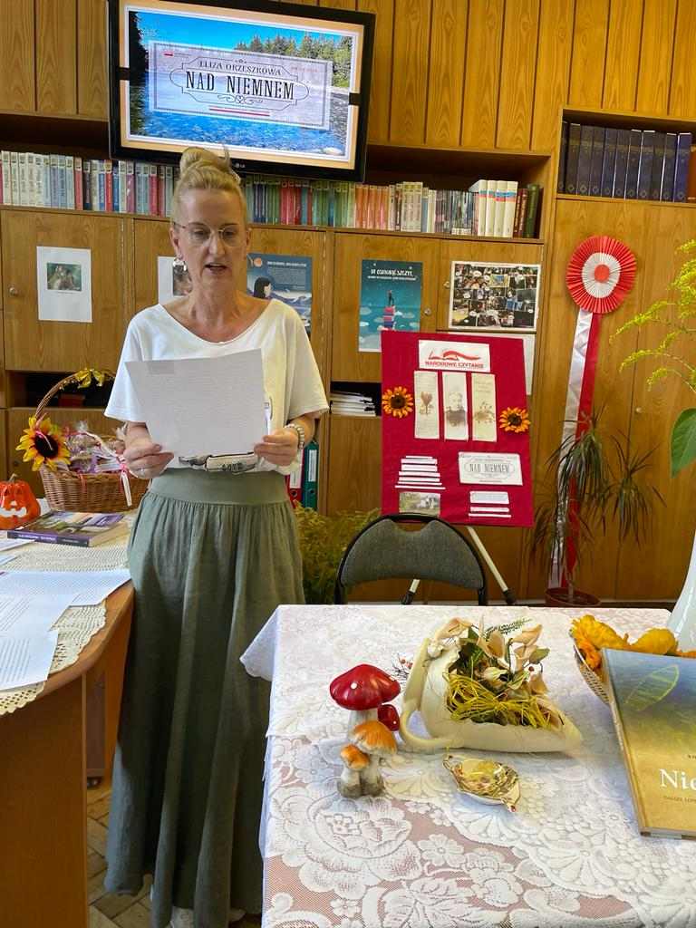 Przyjemnej zabawie czytelniczej towarzyszył klimat nawiązujący do tej wiejskiej epopei: pachnące polne kwiaty, tematyczne gadżety, patriotyczne akcenty. Spotkanie poprowadziły uczennice klasy 2 TG: Natalia Dragun oraz Wiktoria Wal. Na zakończenie uroczystości każdy uczeń otrzymał piernika z mottem zaczerpniętym z lektury. Tak więc: