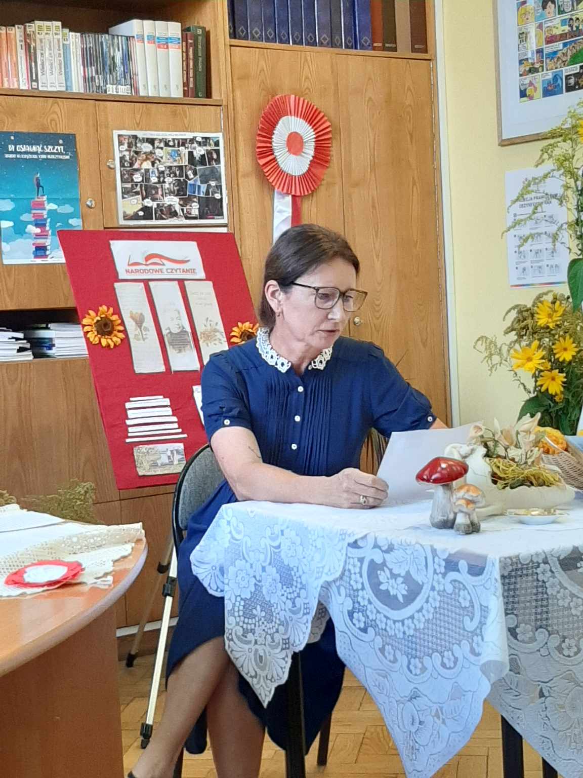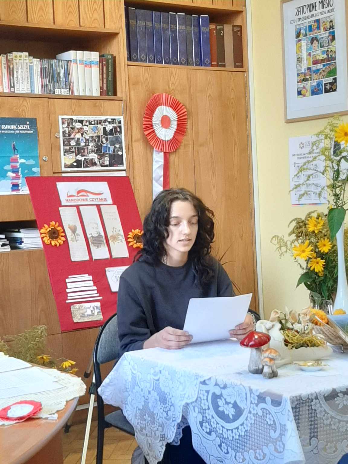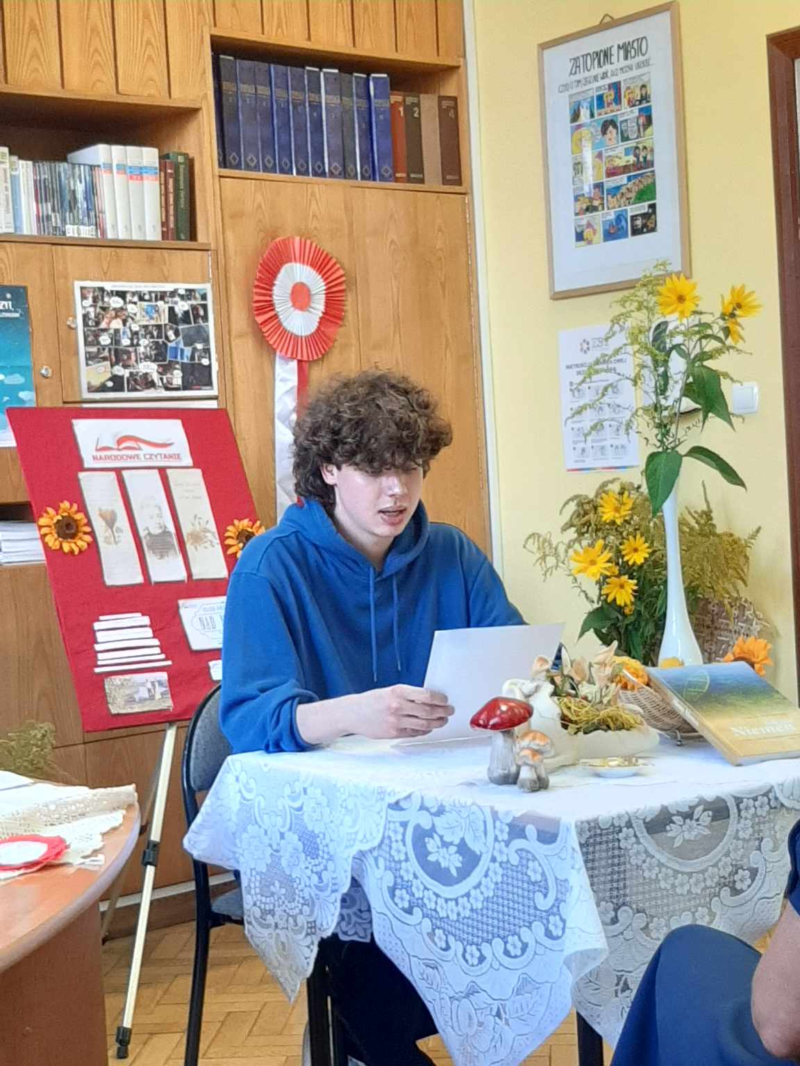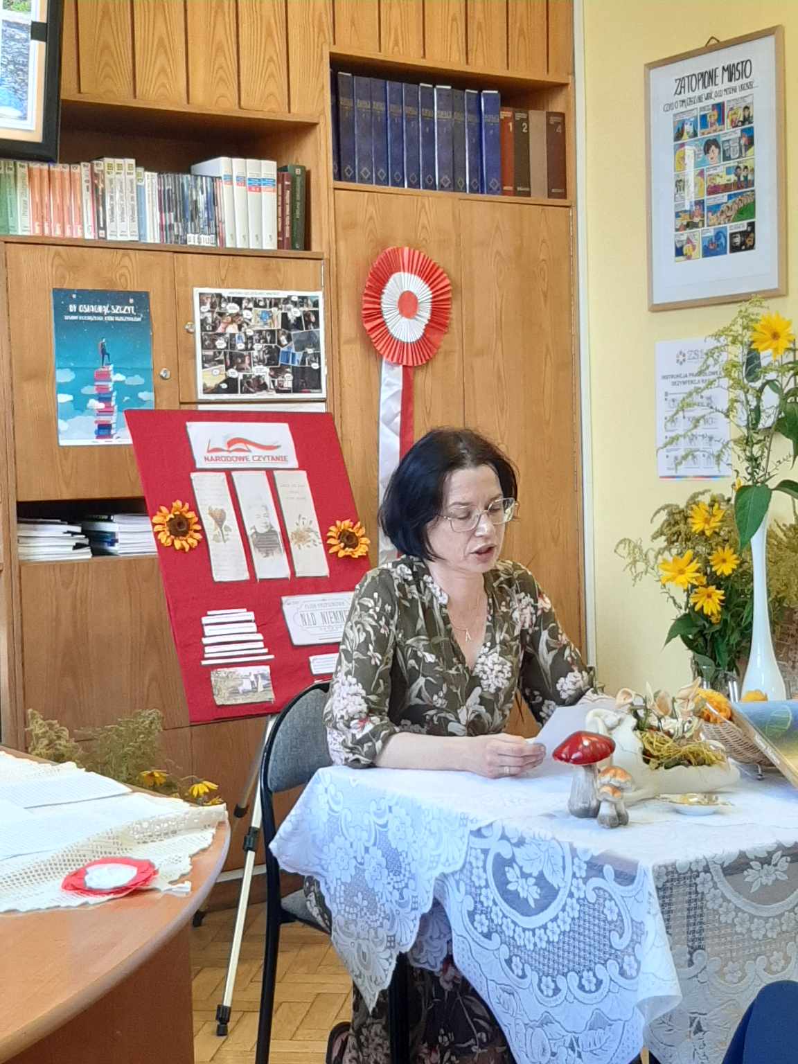 Przyjemnej zabawie czytelniczej towarzyszył klimat nawiązujący do tej wiejskiej epopei: pachnące polne kwiaty, tematyczne gadżety, patriotyczne akcenty. Spotkanie poprowadziły uczennice klasy 2 TG: Natalia Dragun oraz Wiktoria Wal. Na zakończenie uroczystości każdy uczeń otrzymał piernika z mottem zaczerpniętym z lektury. Tak więc: