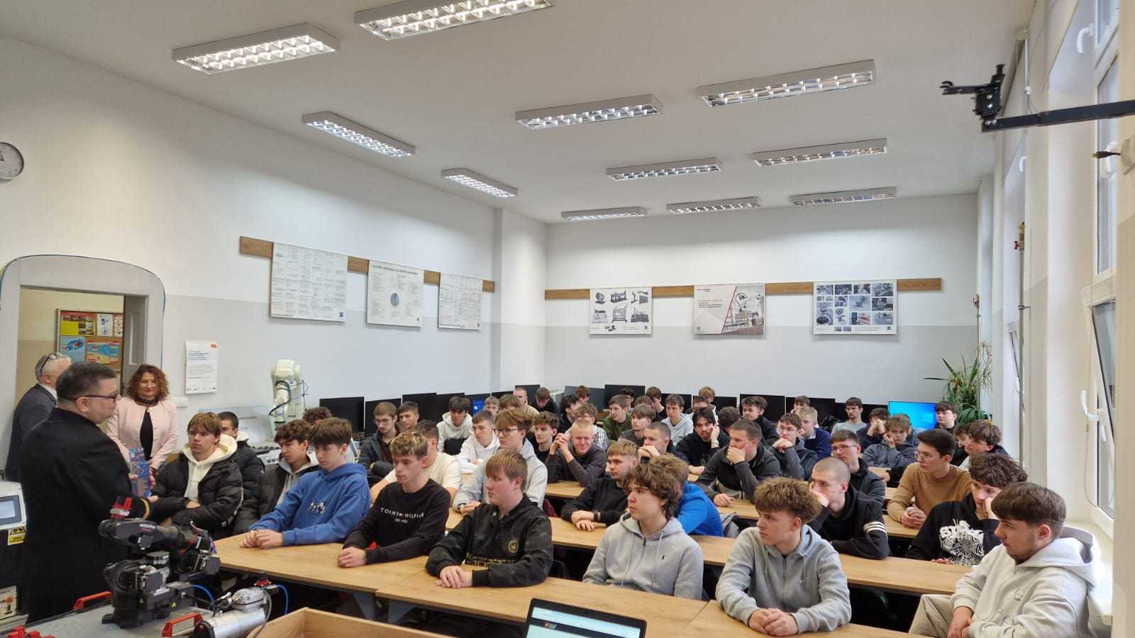 We wtorek 02.12.2025r. w Zespole Szkół nr1 odbyło się spotkanie uczniów klas mechanicznych, elektrycznych i robotyki: 5TM, 4TM, 3TM, 4TE i 2TR z przedstawicielem Wydziału Mechanicznego Politechniki Morskiej – Pełnomocnikiem ds. Promocji dr inż. Markiem Pijanowskim.