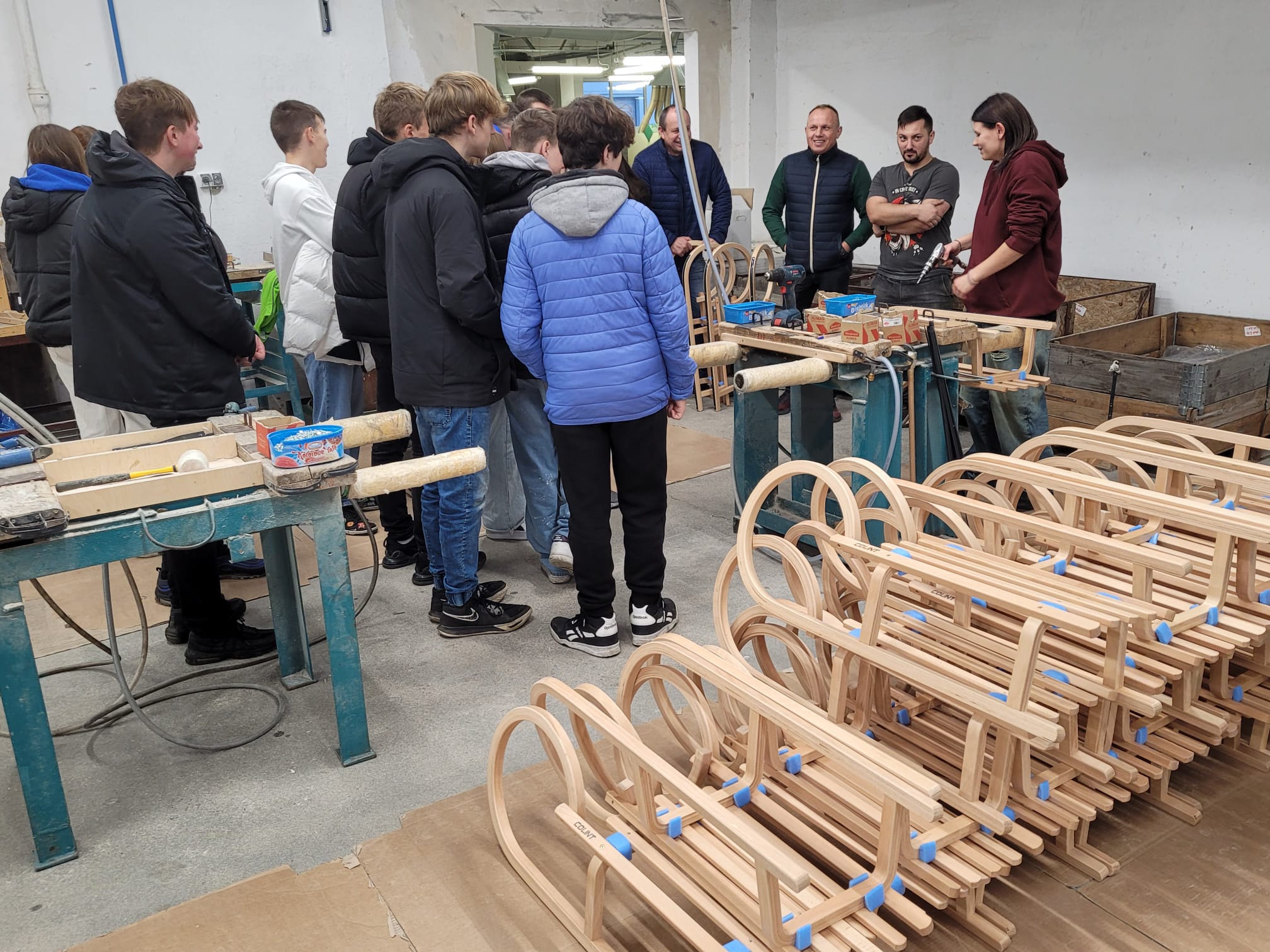 Po szczegółowym omówieniu procesu powstawania łodzi, grupa przeszła do pomieszczenia, w którym powstają drewniane sanki. Firma zajmuje się produkcją dwóch rodzajów sanek – standardowych i ekskluzywnych. Powstawaniu produktu towarzyszy długi proces. Najpierw drewno jest w odpowiedni sposób obrabiane, by później trafić na stanowiska, gdzie tworzone są poszczególne części sanek. Produkty lakierowane są w specjalnym pomieszczeniu. Widzieliśmy również jak powstają plastikowe części sanek, oraz ogromną halę, w której przechowywane są wszystkie ukończone sanki.