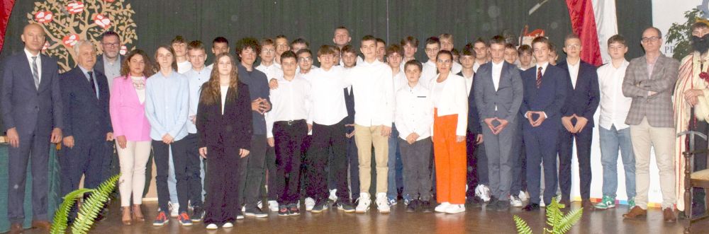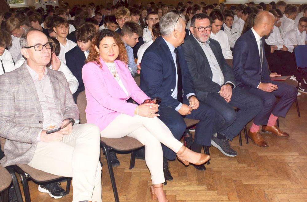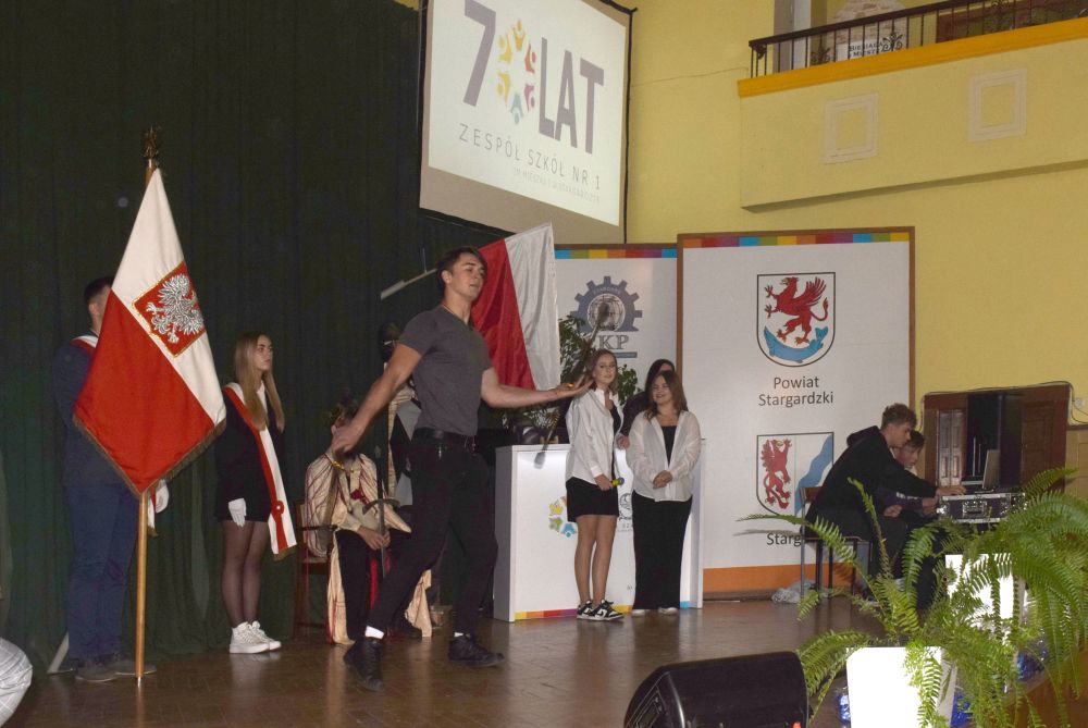 W tym uroczystym dniu nie zabrakło niespodzianek… Na uroczystości zjawił się Patron Szkoły – Mieszko I, we własnej osobie. Dostojny gość pasował średniowiecznym mieczem młodzieniaszków na żaków szkolnej społeczności.