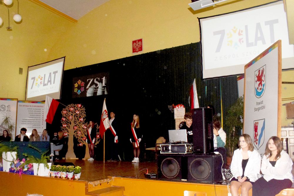 Po wprowadzeniu Pocztu Sztandarowego wszyscy odśpiewali hymn narodowy, a następnie głos zabrał Dyrektor Szkoły mgr inż. Tomasz Korytkowski . W pełnym refleksji przemówieniu przybliżył historię szkoły oraz przedstawił szkołę ,,dzisiejszą”, kształcącą nowoczesnymi metodami, wykwalifikowanych pracowników technicznych.