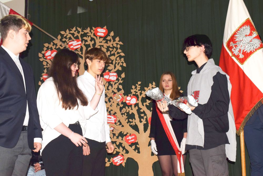 Uczniowie klas pierwszych złożyli ślubowanie w imieniu swoim i pozostałych uczniów. Ślubowali na sztandar szkoły, że staną się godnymi jej tradycji i że będą sumiennie wypełniać obowiązki ucznia.