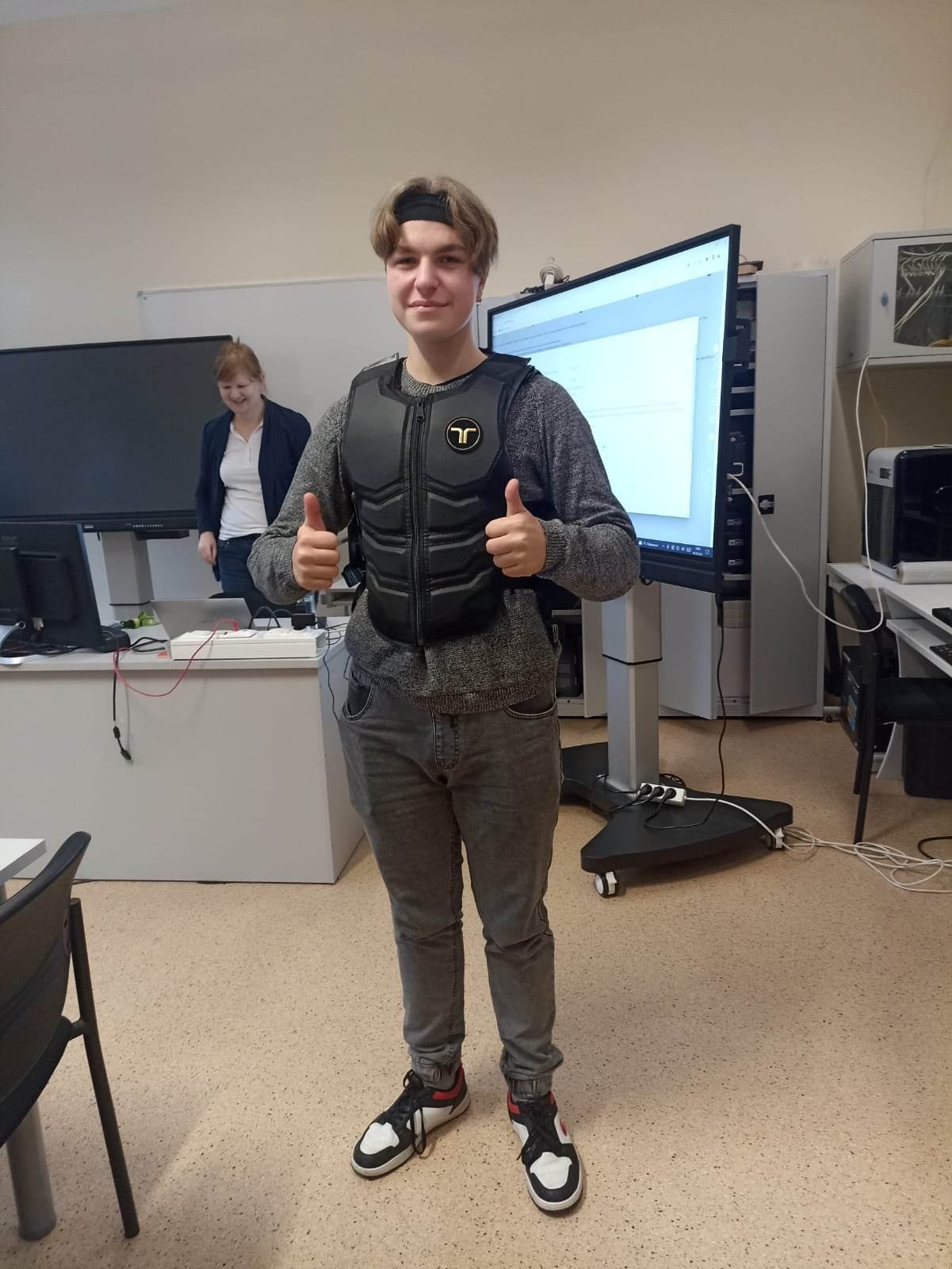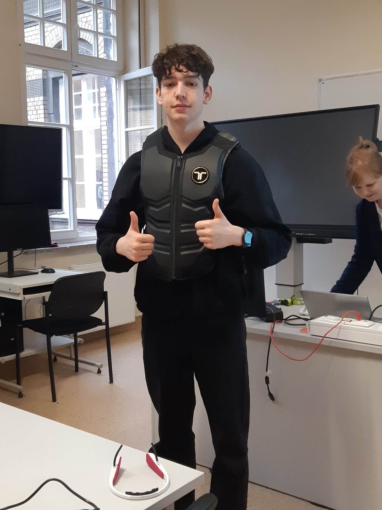Pani mgr inż. Magdalena Nozdrzykowska wprowadziła nas w zasady pracy w zespole, na czym polega praca menadżera zespołu, który przydziela zadania grupie odpowiedzialnej za wykonanie projektu. Mieliśmy możliwość poznać i przetestować możliwości kamizelki haptycznej, czyli np. „poczuć” muzykę. Taka kamizelka pozwala poczuć postrzał z pistoletu, ugryzienie insekta, prędkość w takcie jazdy wirtualnym pojazdem i wiele innych atrakcji.