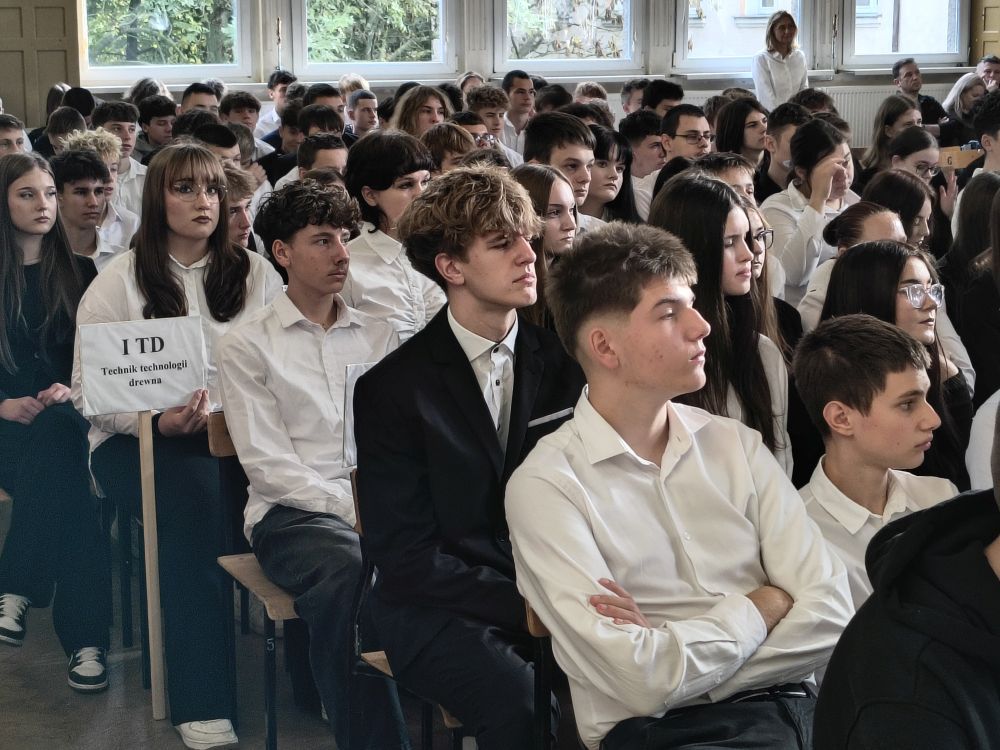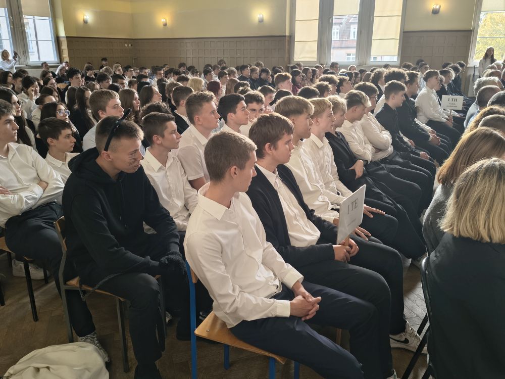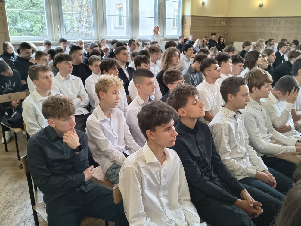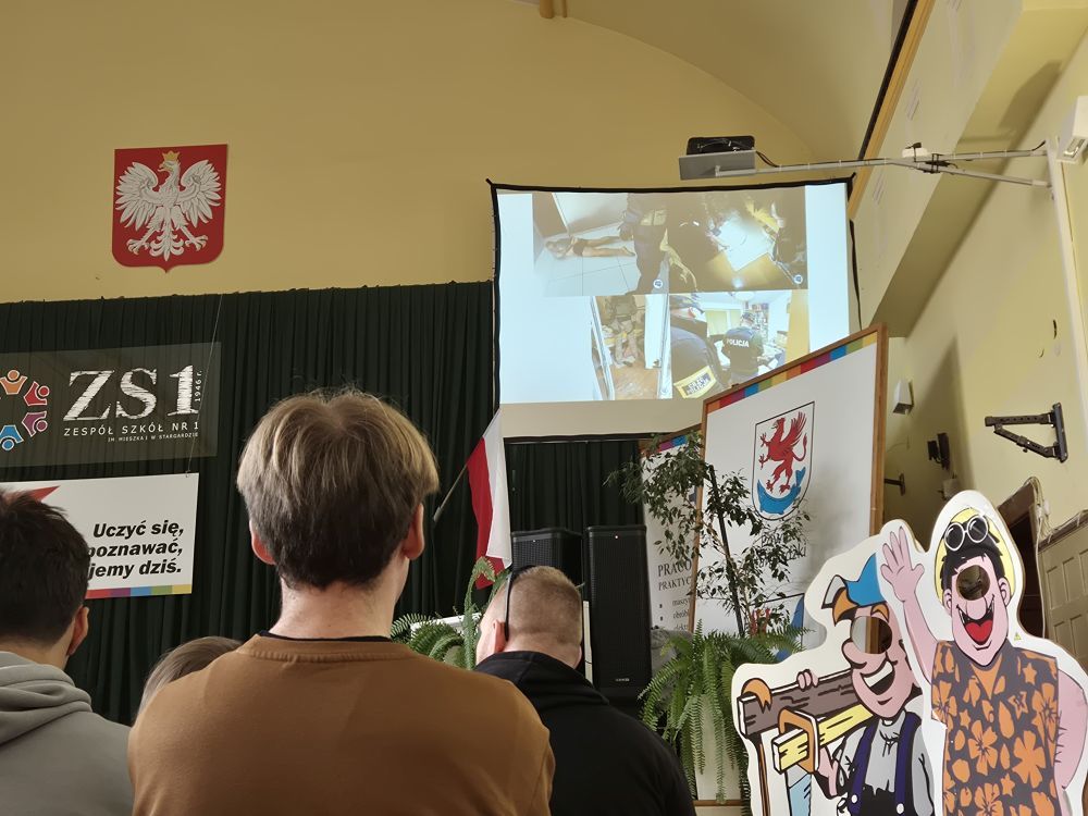 Przed tegorocznymi maturzystami egzamin dojrzałości. Małymi krokami uczniowie klas V wkroczą w dorosłe życie oraz obowiązki zawodowe. W ramach promocji zawodu policjanta uczniowie klas: IV TI, V TH, IV TR, IV TE, V TI, V TLR i IV TH mogli dowiedzieć się na czym polega praca policjantów z Centralnego Biura Zwalczania Cyberprzestępczości. Spotkali się dnia 15 października 2025 roku (środa) w auli szkoły z przedstawicielami CBZC ze Szczecina: nadkom. Piotrem Bejgerem, kom. Krzysztofem Ardowskim oraz mł. asp. Natalią Misiewicz.