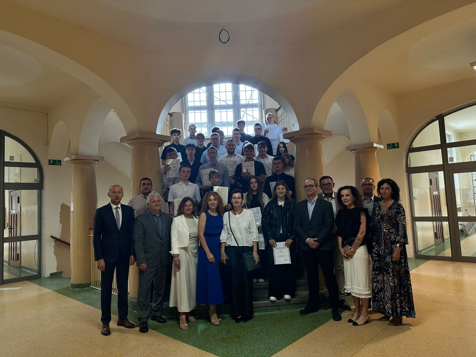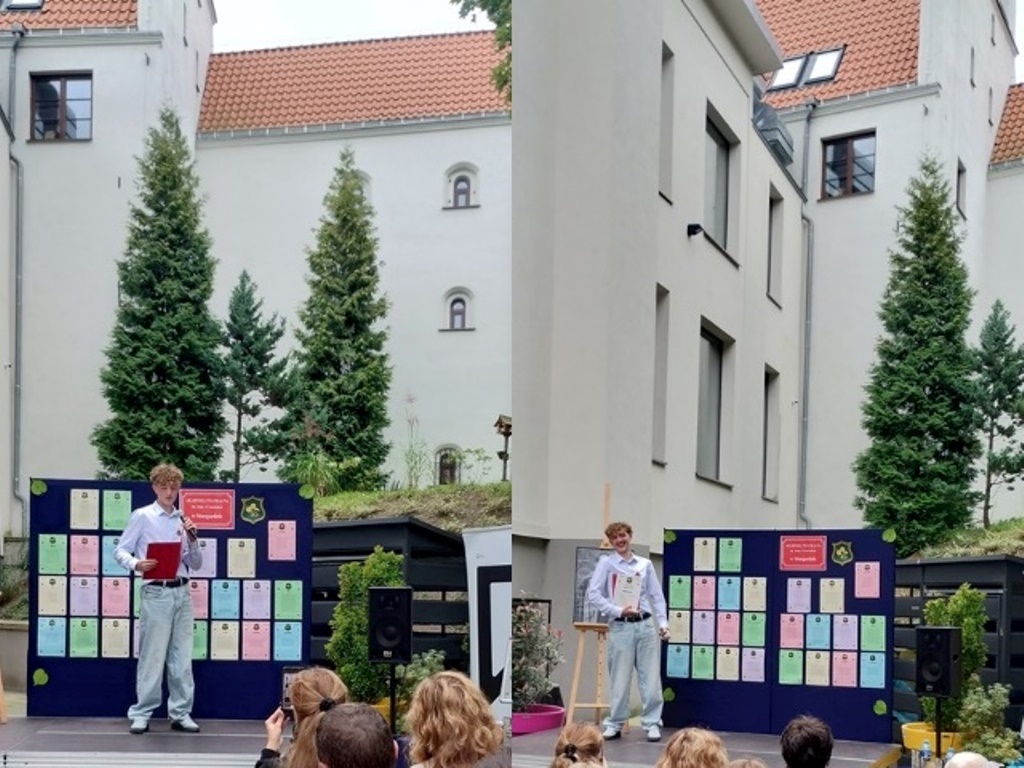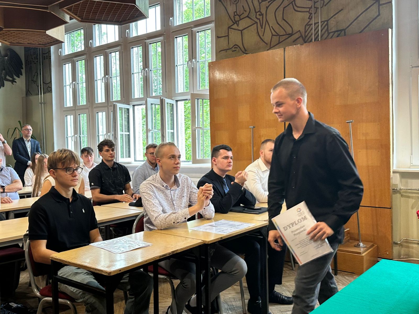 Dnia 27 czerwca 2025 r odbyło się zakończenie roku szkolnego. O godzinie 8 uczniowie spotkali się z wychowawcami w klasach, natomiast o godzinie 9 odbyło się uroczyste zakończenie z dyrekcją szkoły. Podczas tego spotkania wręczono świadectwa z wyróżnieniem uczniom, którzy uzyskali średnią ocen 4,75 i wyżej oraz conajmniej bardzo dobrą ocenę z zachowania. Takich uczniów w tym roku szkolnym było 25. Najwyższą średnią ocen uzyskał uczeń klasy 4 TH Dominik Pawluk.