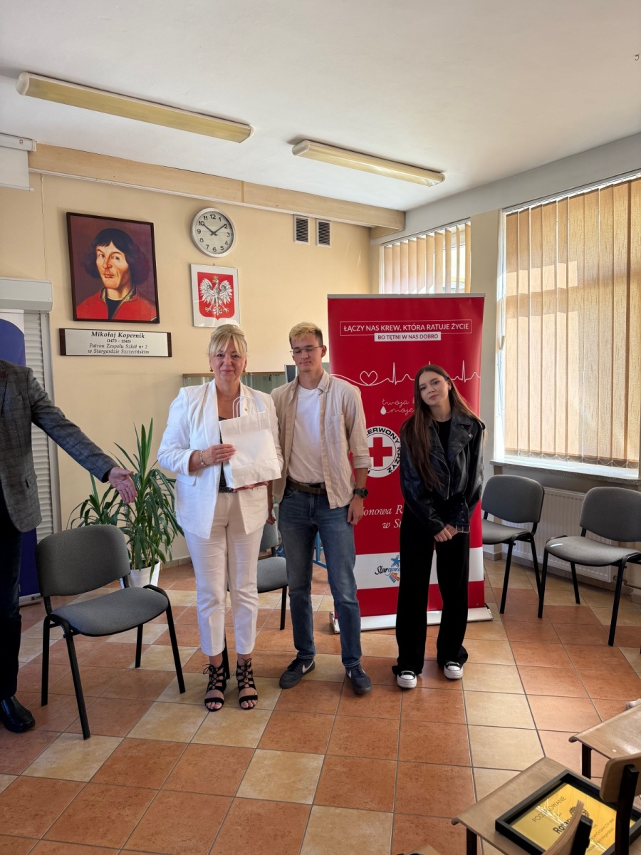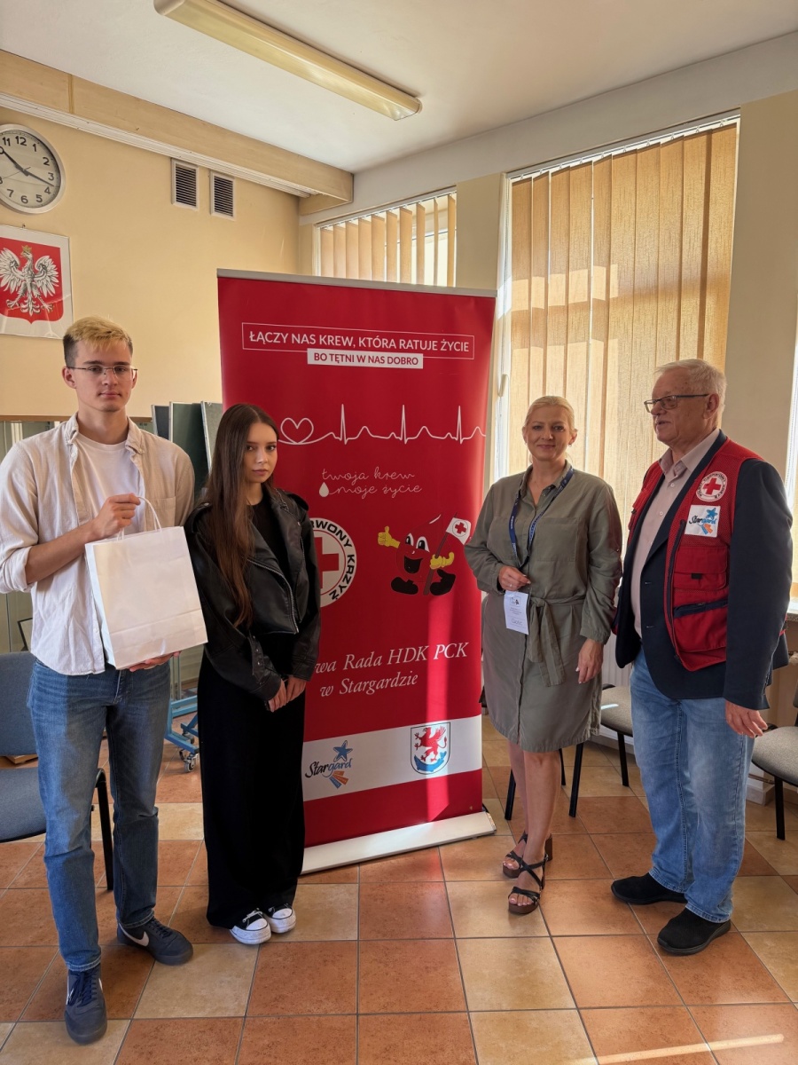 W dniu 9 września 2025 uczniowie naszej szkoły wraz z opiekunem- Panią Agnieszką Dyczko wzięli udział w spotkaniu, które odbyło się w Zespole Szkół nr 2. W tym dniu opiekunom szkół zaangażowanych w organizację Akcji Poboru Krwi zostały przekazane książeczki Honorowych Dawców Krwi. Książeczki dla młodych krwiodawców zostały sfinansowane przez Rotary Club Stargard, w imieniu klubu wręczyła je Pani Małgorzata Motylińska-Haczyk.