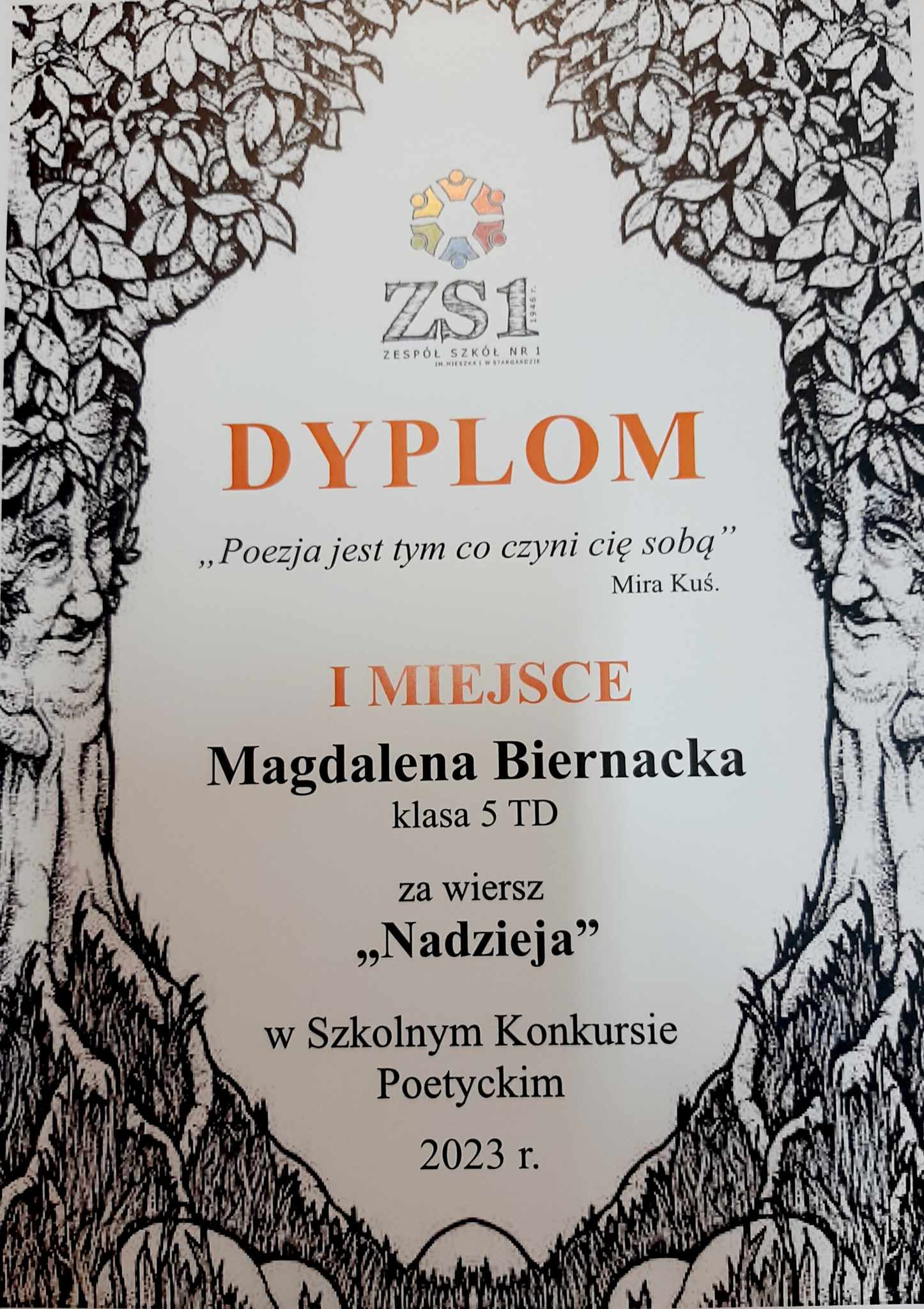 1. miejsce – Magdalena Biernacka 5 TD za wiersz “Nadzieja”,