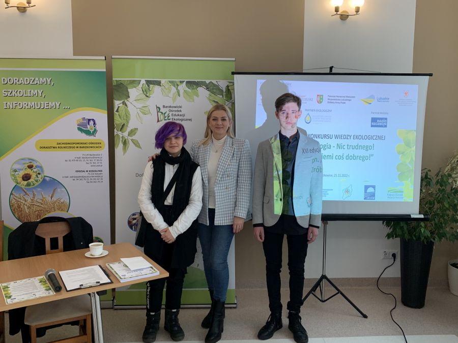 25 listopada w Barzkowicach odbył się finał Ekologicznego Konkursu Wojewódzkiego pod hasłem :„ Ekologia- Nic trudnego! Zrób dla Ziemi coś dobrego”. W konkursie wzięło udział 19 szkół średnich z 2 województw: zachodniopomorskiego i lubuskiego. Łącznie w finale rywalizowało między sobą aż 38 osób. Naszą szkołę reprezentowali: Izabella Gazda i Jakub Jeske ( zwycięzcy eliminacji szkolnych). Pierwsza część konkursu odbyła się w formie testu pisemnego, 6 osób z najwyższą punktacją – w tym uczeń naszej szkoły Jakub Jeske przeszło do finału, który odbył się w formie ustnej.