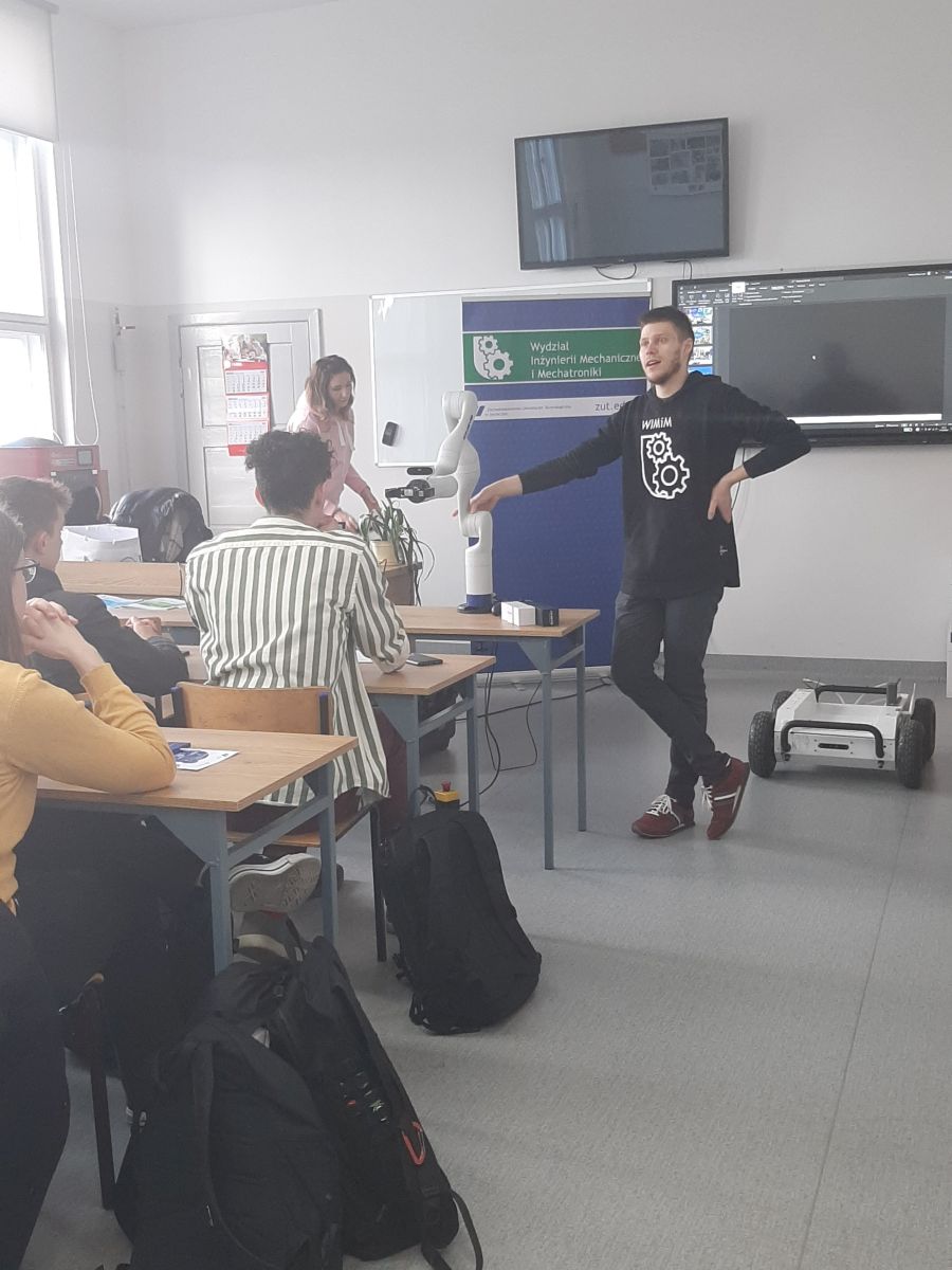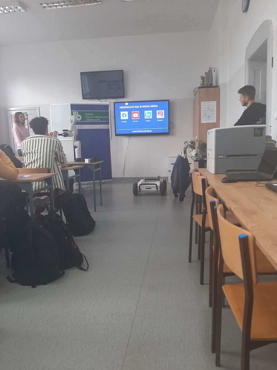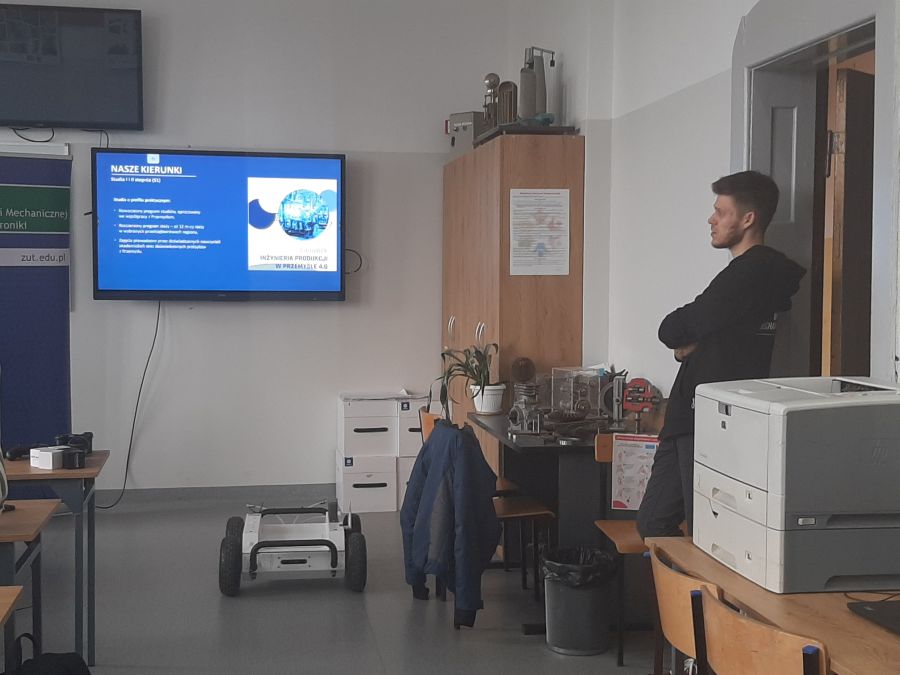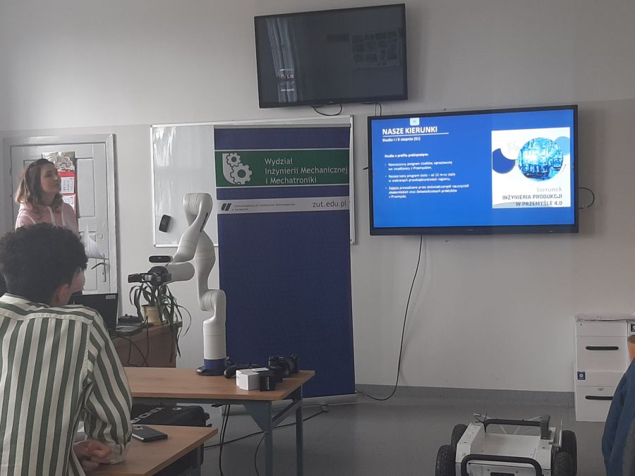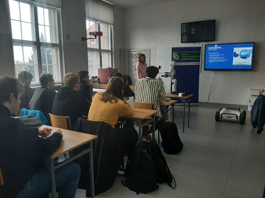 Podczas spotkania zaprezentowano informacje na temat wydziału, oferowanych kierunków studiów, kariery zawodowej. Jako jeden z najbardziej zrobotyzowanych wydziałów w regionie, przedstawiciele zaprezentowali uczniom dwa roboty. Pierwszy to semi-autonomiczny robot, którym uczniowie mogli własnoręcznie pokierować po korytarzach szkoły. Drugi robot to jeden z najbardziej zaawansowanych rozwiązań – cobot o 7 stopniach swobody z którym uczniowie również zmogli się zmierzyć.