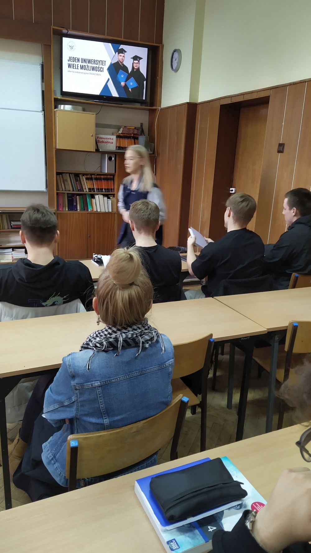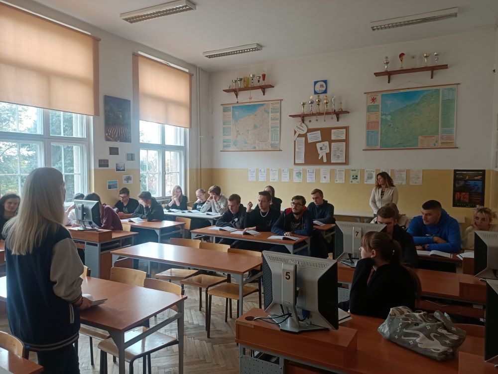 Dnia 9.11.2023r. gościliśmy w naszej szkole przedstawiciela Uniwersytetu Szczecińskiego – panią Natalię Świątek z Biura Rekrutacji US, która zaprezentowała ofertę edukacyjną na rok 2024/ 2025. W czasie spotkania uczniowie dowiedzieli się o dostępnych kierunkach w ofercie US, co to są kryteria kwalifikacji i jak odczytywać algorytm oraz jakie przedmioty zdawać na maturze, aby dostać się na wymarzony kierunek studiów. Jako przyszli studenci Uniwersytetu Szczecińskiego mogą korzystać ze strefy wsparcia i rozwoju m.in. Akademickiego Biura Karier, Centrum Edukacji Medialnej i Interaktywności, WIR- Zespół Wsparcia i Rozwoju, a także Programu Erasmus+ oraz Programu MOST). Pani Natalia zachęciła serdecznie naszych maturzystów do wzięcia udziału w bezpłatnych kursach maturalnych online. Szczegółowe informacje dostępne są na stronie:https://kandydaci.usz.edu.pl/kursy-maturalne/ .