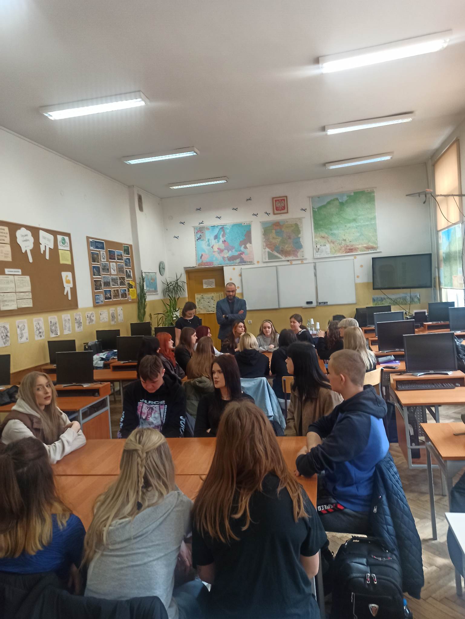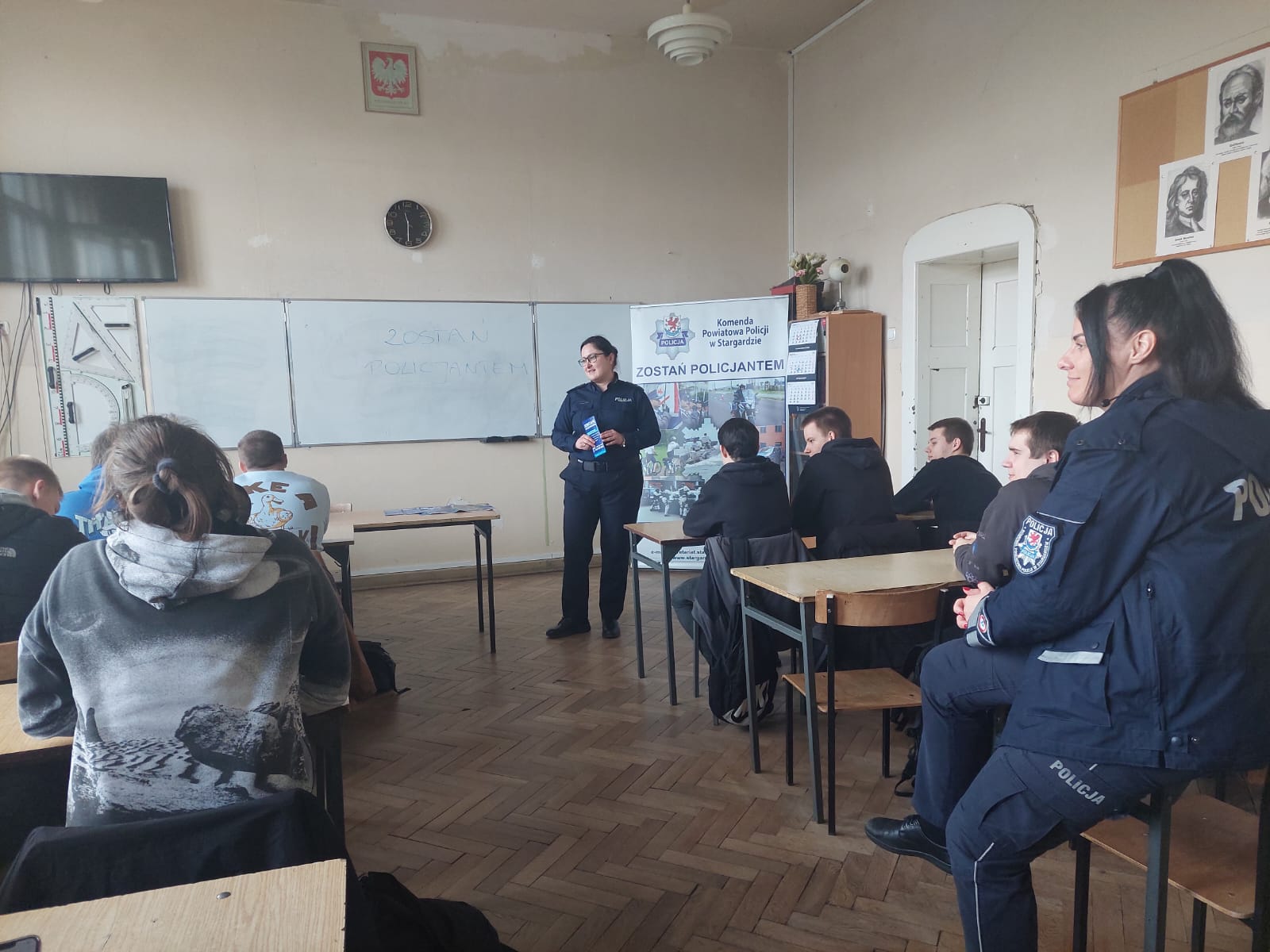 Dnia 12 kwietnia 2023 roku uczniowie klasy czwartej technikum elektronicznego i mechanicznego mieli okazję spotkać się z przedstawicielami stargardzkiej Policji – młodszym aspirantem Dorotą Biernikowicz i młodszym aspirantem Justyną Siwarską.
