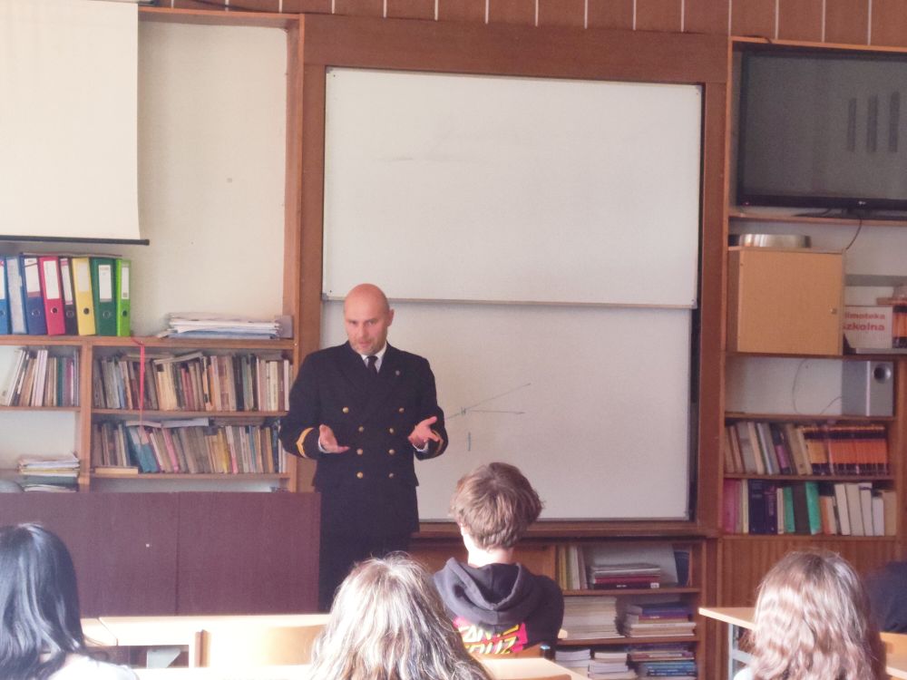 W auli szkoły pani mgr inż. Izabela Kamińska z Wydziału Inżynieryjno-Ekonomiczny Transportu i pan mgr Rafał Zaweracz z Biura Promocji PM przedstawili i omówili uczniom klas maturalnych: 5THI, 5TI, 5TD, 5TEL wszystkie kierunki studiów, na których kształcą się przyszli specjaliści do pracy na morzu, jak i na lądzie.