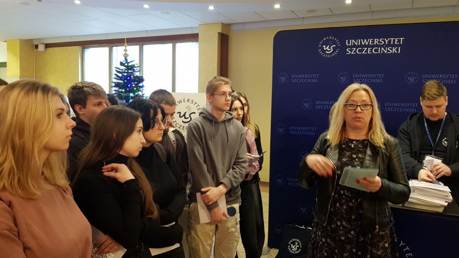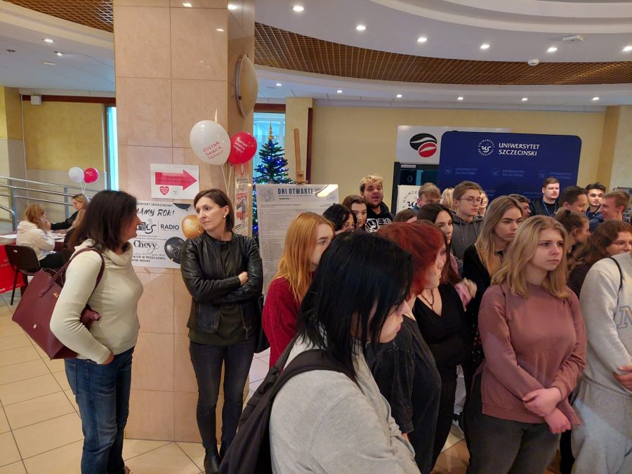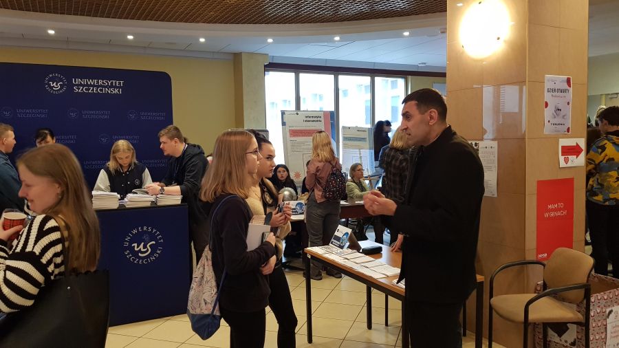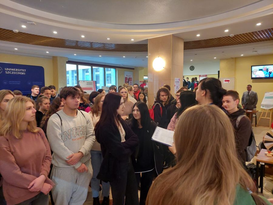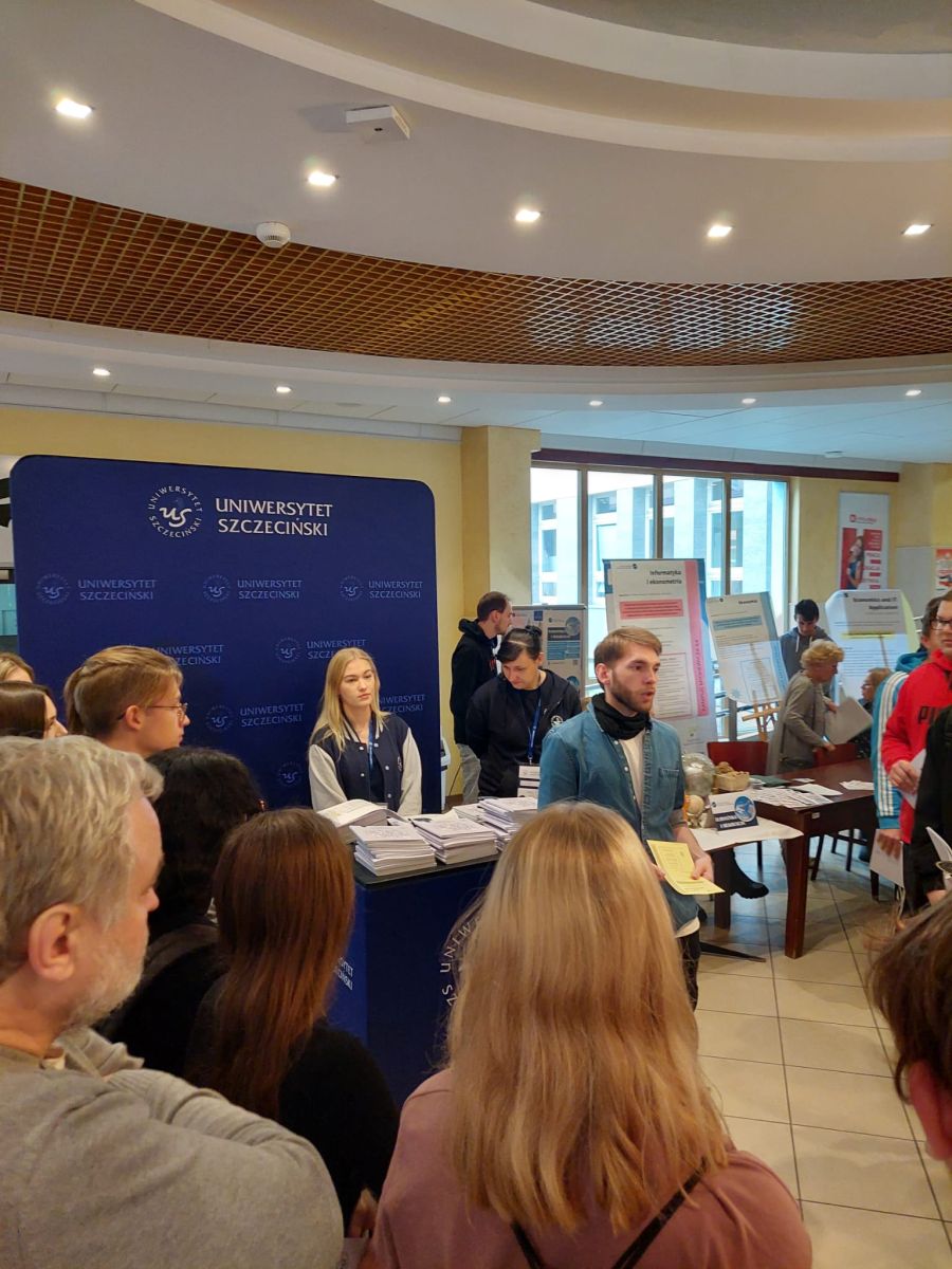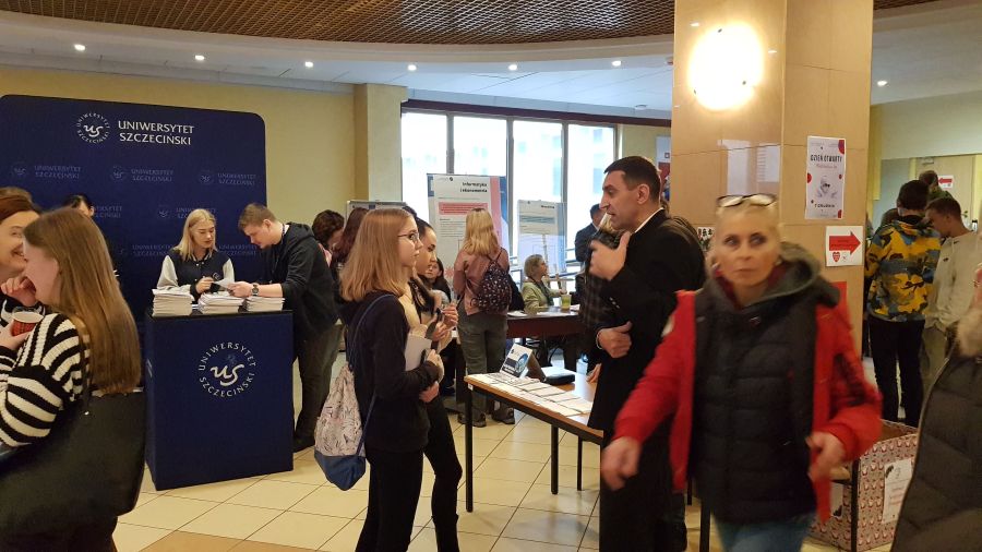 Dzień ten obfitował w różnego rodzaje atrakcje i wydarzenia. Na początku uczniom zaprezentowano sale wykładowe, pracownie i stoiska przedstawiające kierunki studiów, gdzie była bardzo pomocna pani Alicja Remiszewska z biura Promocji US, która odpowiadała na nurtujące młodzież pytania dotyczące oferty Uczelni, kierunków studiów, zasad rekrutacji itp.