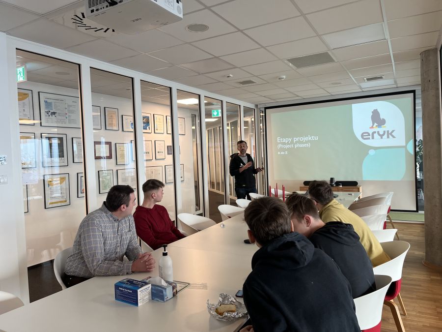 Firma Eryk specjalnie dla świeżo upieczonych absolwentów szkół technicznych przygotowała płatny program stażowy, który pozwala na zdobywanie doświadczeń w międzynarodowych projektach pod okiem Team Leaderów. Wydarzenie było podzielone na trzy segmenty, w których pracownicy opowiedzieli o: