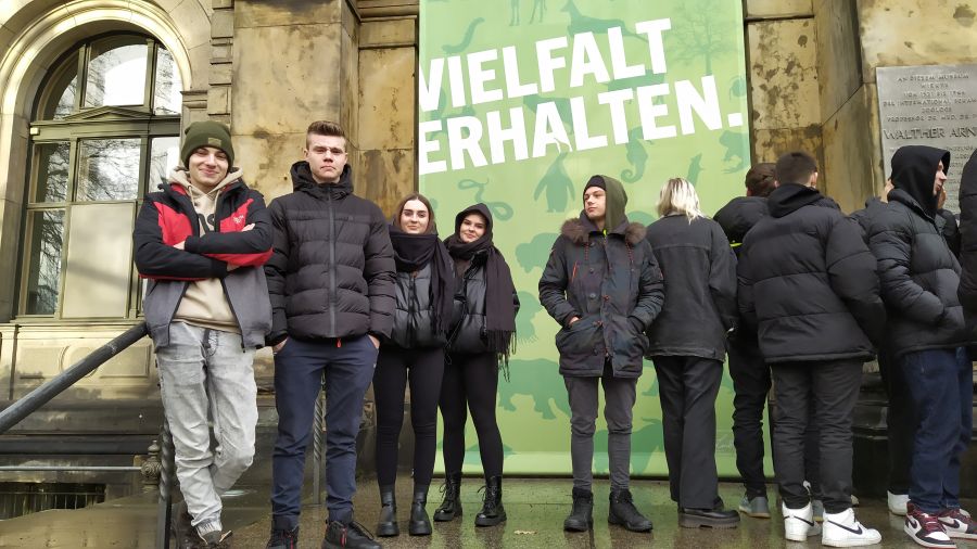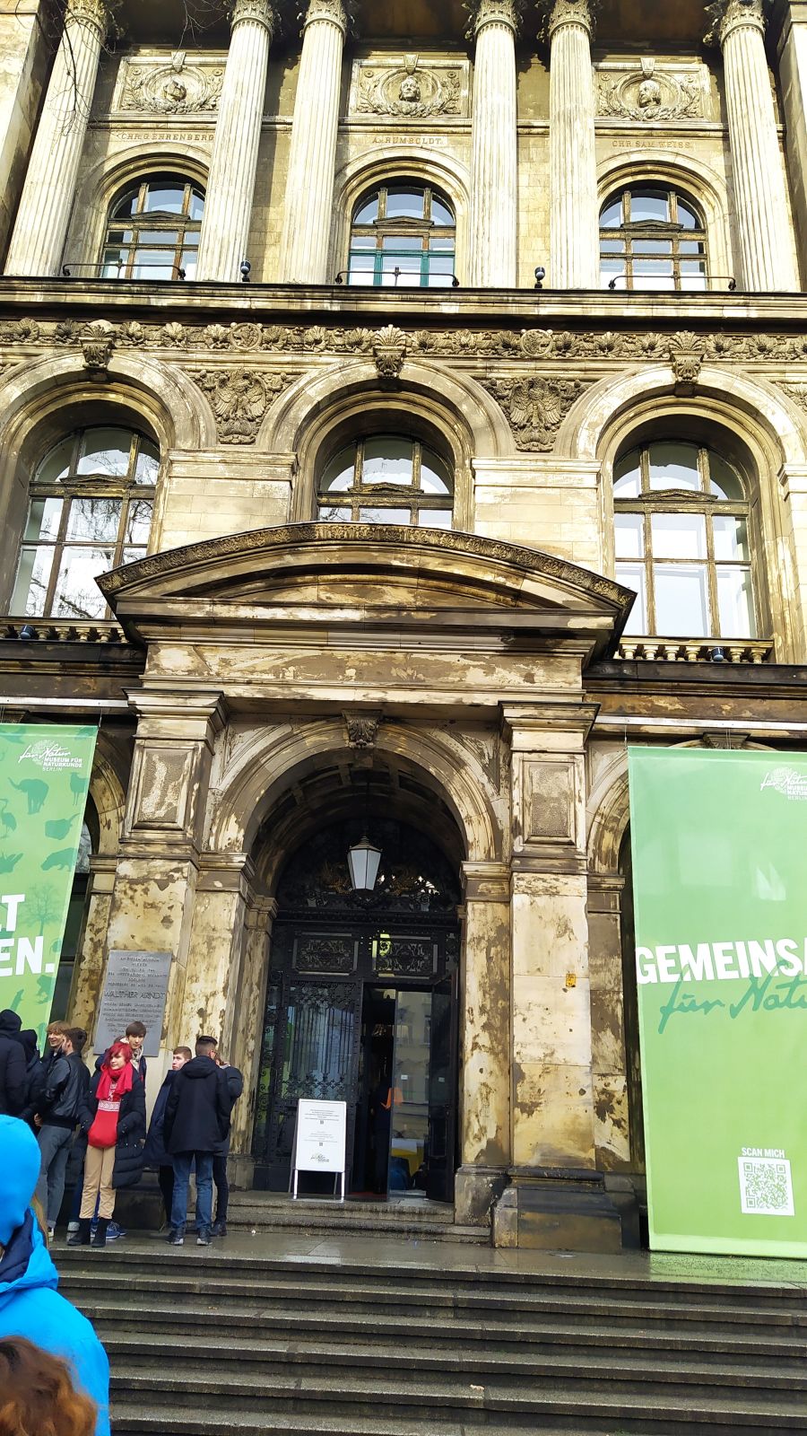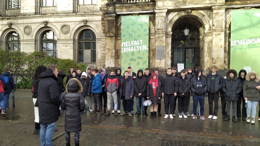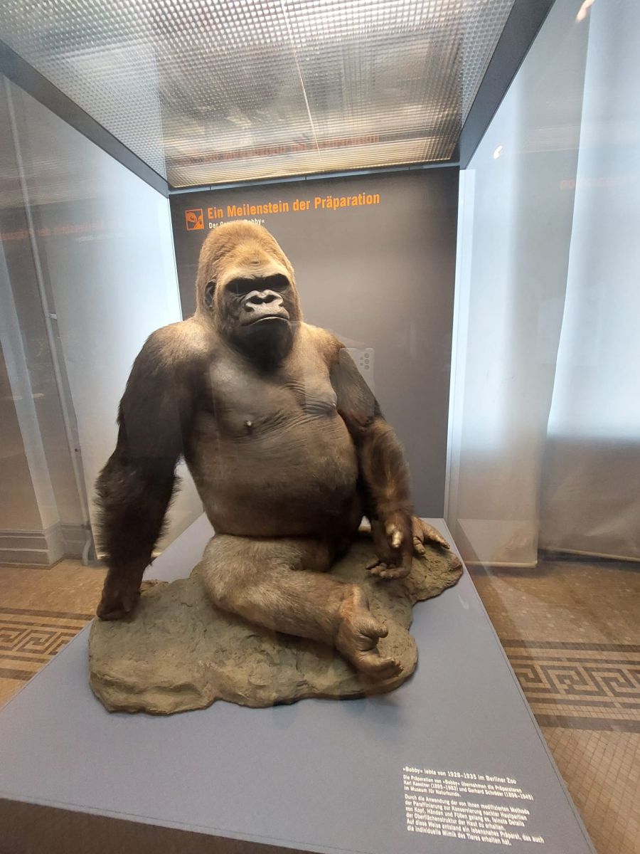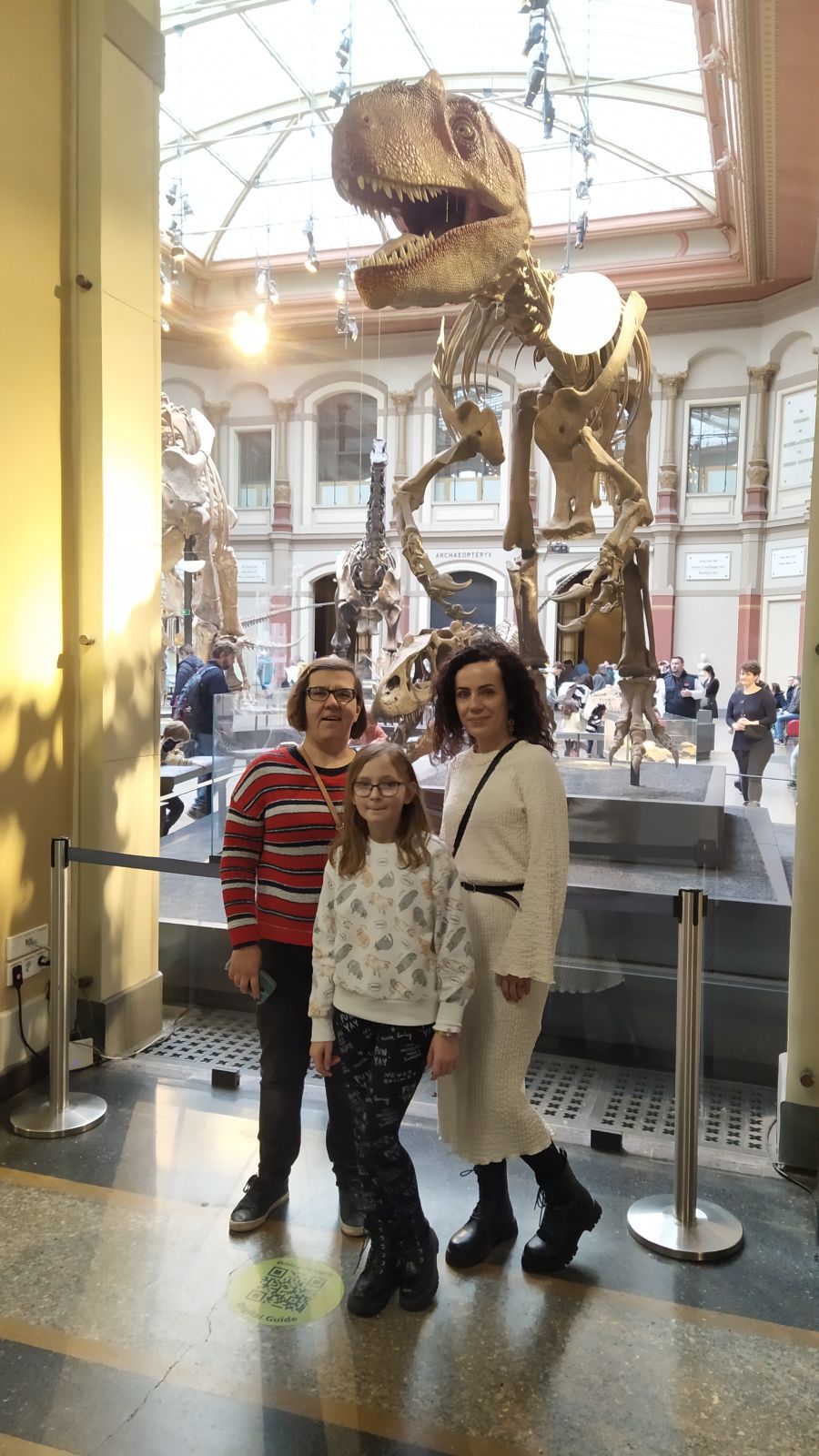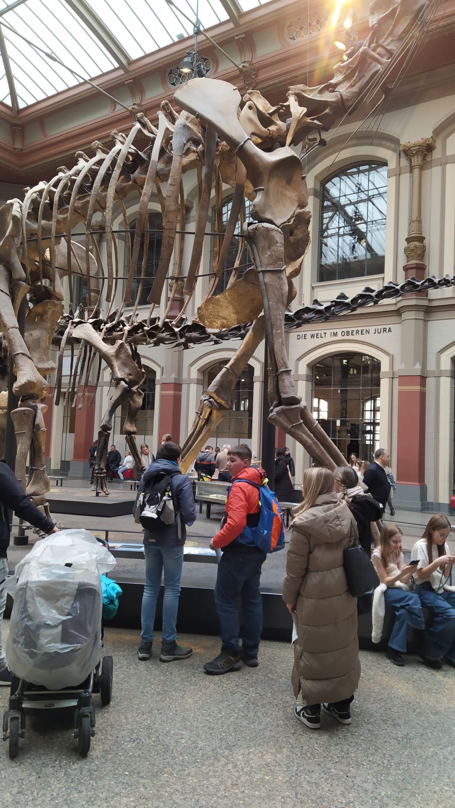 Pierwszym punktem naszej wycieczki było Muzeum Historii Naturalnej (Museum für Naturkunde). Mogliśmy zobaczyć tam szkielety dinozaurów, skamieliny, również „gości z kosmosu” – meteoryty, jak i coś bliżej nas – minerały. Znajduje się tam m.in. dużych rozmiarów bursztyn, znaleziony niedaleko Kamienia Pomorskiego (waży prawie 10 kg), a także bryła złota ważąca 36 kg, będąca prezentem od Ministerstwa Finansów Rosji.
