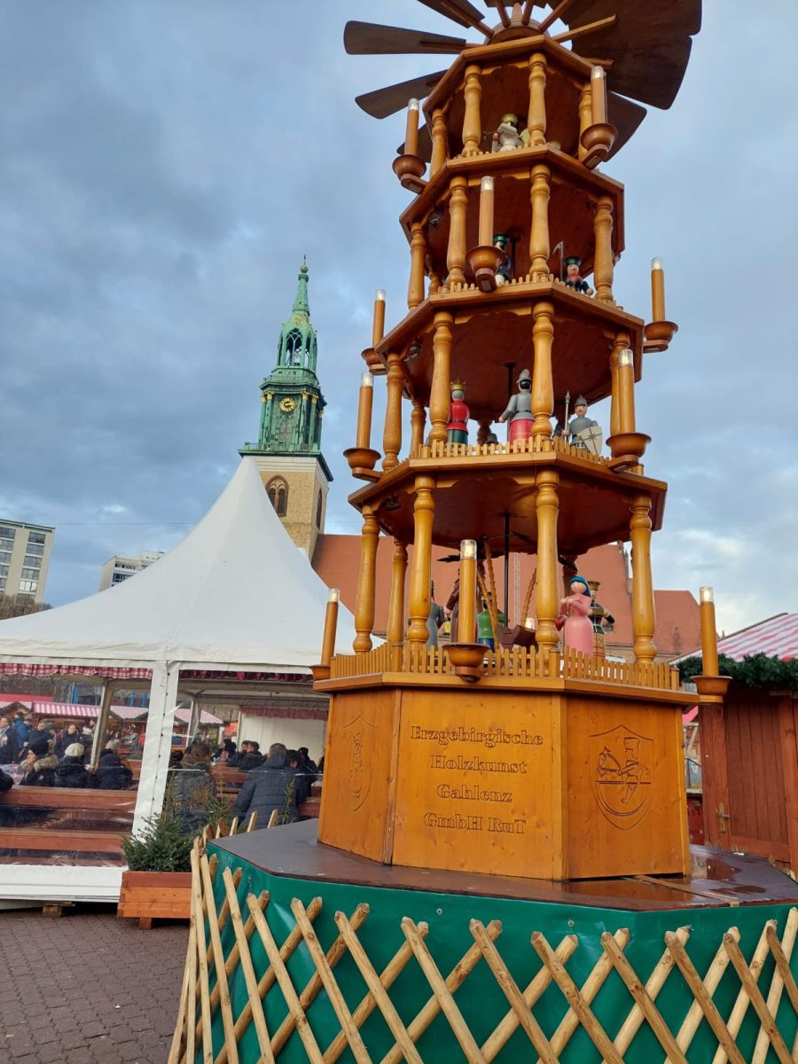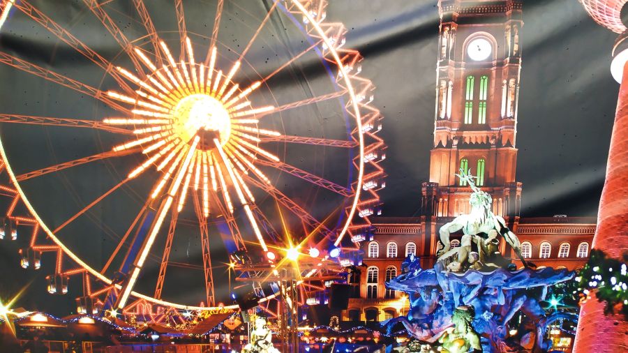 Można było tam znaleźć też spreparowane zwierzęta. Później udaliśmy się na Jarmark Świąteczny pod Czerwonym Ratuszem (Rotes Rathaus in Berlin). Można tam było kupić drobne upominki i zjeść coś ciepłego. Jego głównymi atrakcjami były m.in. lodowisko, koło młyńskie, karuzela oraz Fontanna Neptuna.