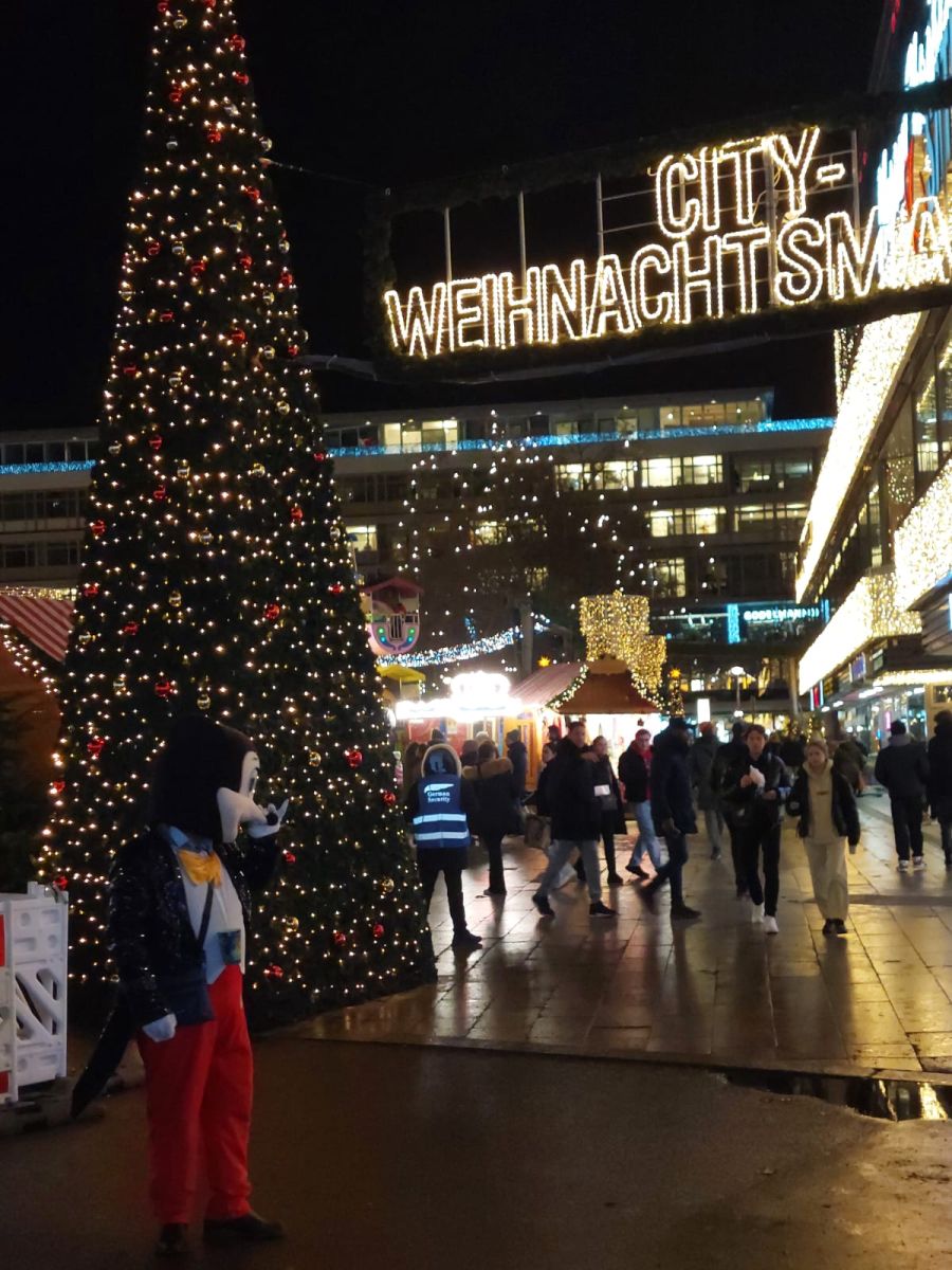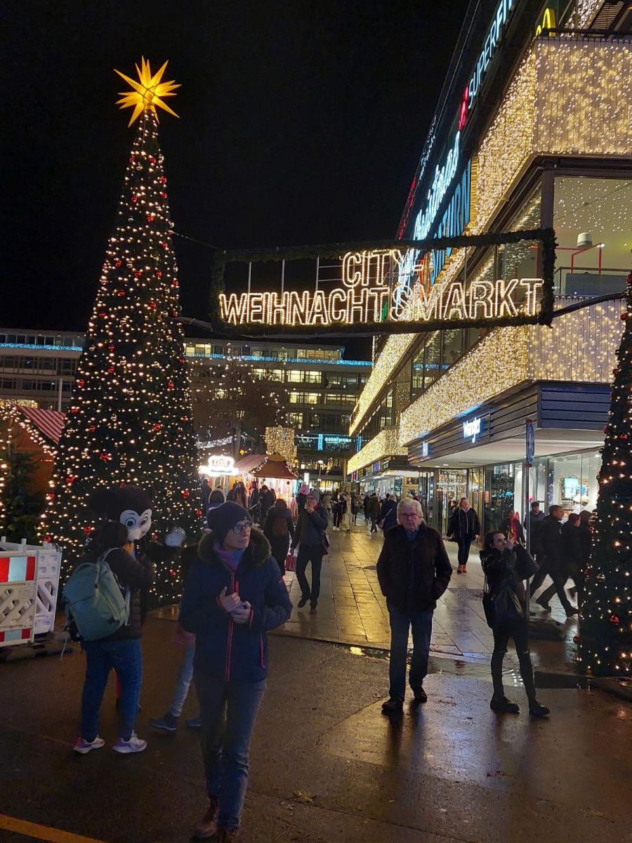 Na koniec dnia udaliśmy się do kulminacyjnego miejsca wycieczki – Jarmarku Bożonarodzeniowego niedaleko Kościoła Pamięci Cesarza Wilhelma przy Ku’damm. Można tam było kupić między innymi przekąski, spróbować słynnego Currywurst, Bratwurst z dobrą niemiecką musztardą, pieczone kasztany, kupić pamiątki oraz ozdoby świąteczne. Mieszkańcy Berlina oraz turyści mogli raczyć się aromatycznym grzanym winem (Glühwein) oraz gorącą czekoladą. Jeśli ktoś miał taką potrzebę, mógł skorzystać z oferty sklepów, m. in. HIT Ulrich.