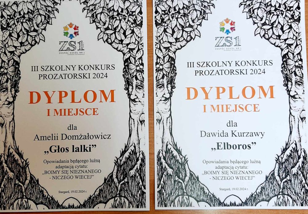 1 miejsce ex aequo zajęli: Amelia Domżałowicz z klasy 4TT za opowiadanie “Głos lalki” oraz Dawid Kurzawa z klasy 5 TI za opowiadanie “Elberos, nieznany świat”.