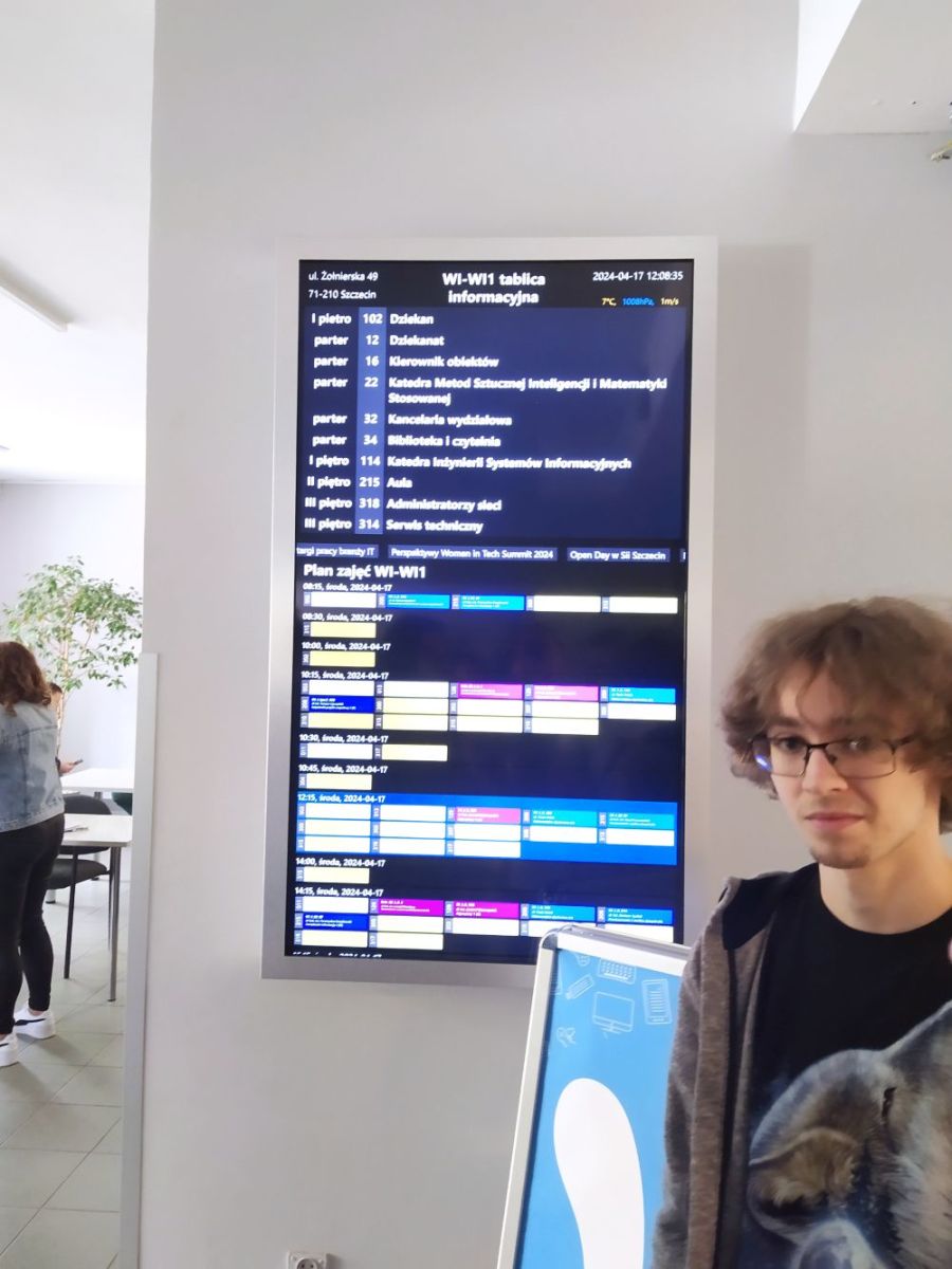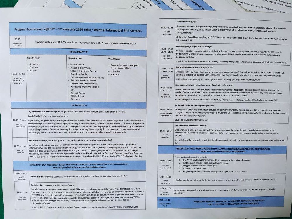 17 kwietnia2024r. Uczniowie klas III i IV pionu Informatycznego odwiedzili siedzibę Wydziału Informatyki ZUT w Szczecinie. Celem wizyty był udział w Targach Pracy dla informatyków i uczestnictwo w zajęciach i wykładach przygotowanych przez pracowników ZUT. Wykłady dotyczyły kwestii prawnych związanych z SI, technologii wizualizacji i przetwarzania obrazów w czujnikach optycznych. Zajęcia praktyczne, w których uczestniczyli nasi uczniowie dotyczyły technologii spawania światłowodów.
