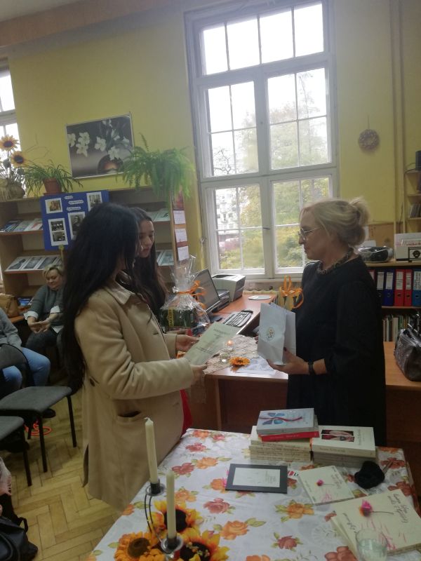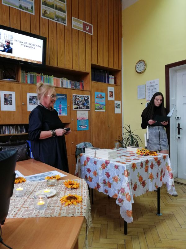 W pierwszej części spotkania uczennica Kornelia Studzińska przybliżyła krótko sylwetkę pisarki. Następnie Pani Iwona Żytkowiak zapoznała zebranych ze swoją twórczością, odpowiadała na pytania uczniów związane z warsztatem pisarskim.