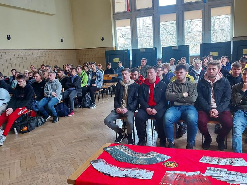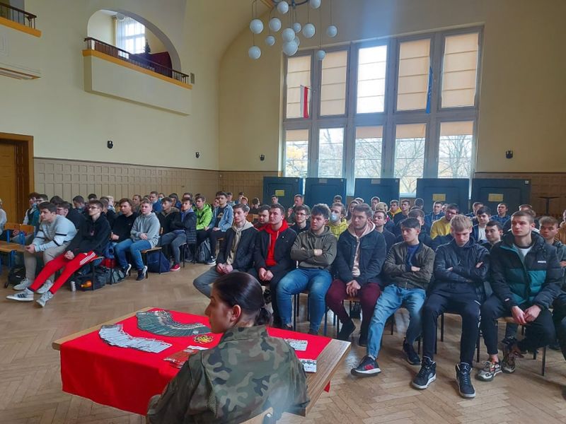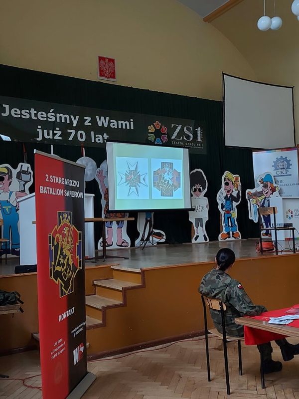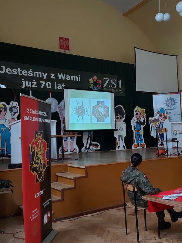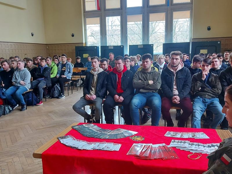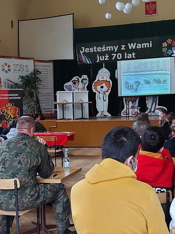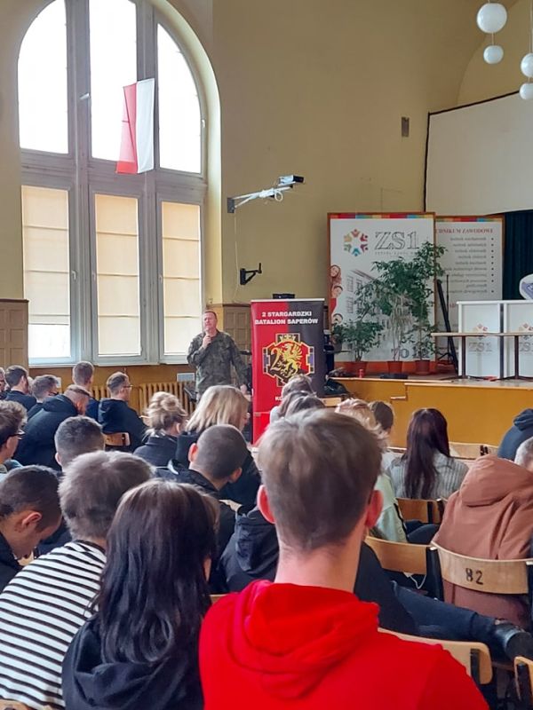 PODCZAS WIZYTY PRZEDSTAWIONO UCZNIOM HISTORIĘ POWSTANIA CZERWONYCH KOSZAR, A TAKŻE CHARAKTERYSTYKĘ SŁUŻBY ŻOŁNIERZA NA BAZIE 2. STARGARDZKIEGO BATALIONU SAPERÓW, ABY ZASZCZEPIĆ W MŁODZIEŻY CHĘĆ WSTĄPIENIA W SZEREGI WOJSKA POLSKIEGO.