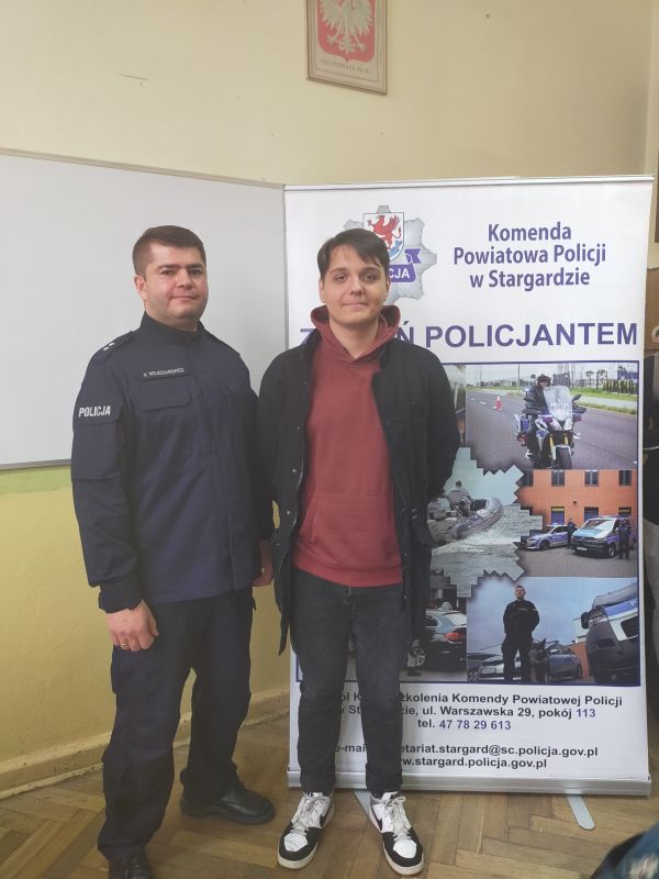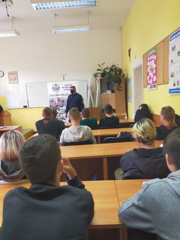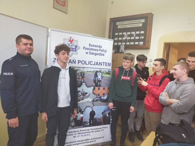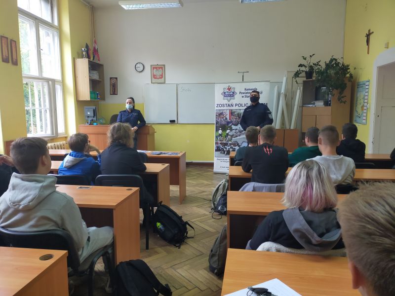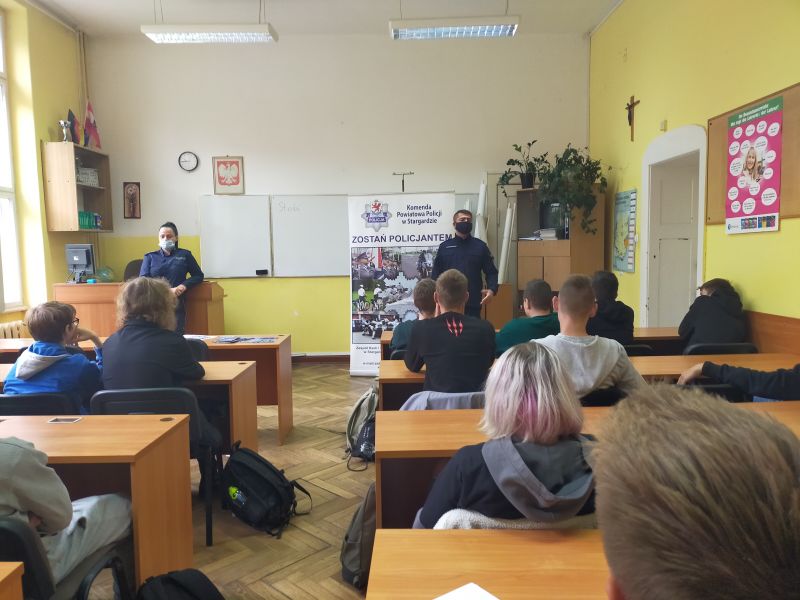W październiku i listopadzie 2021r. przedstawiciele Komendy Powiatowej Policji w Stargardzie, Pani mł. asp. Justyna Siwarska i Pan kom. Krzysztof Wojsznarowicz , spotykali się z uczniami klas drugich naszej szkoły, prowadząc panel tematyczny zajęć edukacyjno- profilaktycznych. Policjanci rozmawiali o prawnych, medycznych i psychologicznych aspektach stosowania środków psychoaktywnych. Podczas zajęć wskazywano młodym ludziom, jakie zagrożenia niosą za sobą substancje psychoaktywne, w tym dopalacze. Ponadto mundurowi przybliżyli zebranym aspekty prawne związane z odpowiedzialnością prawną nieletnich.Uczniowie usłyszeli też czym jest cyberprzemoc, jakie są jej przejawy oraz jakie przestępstwa najczęściej są popełniane w jej ramach i jakich zasad powinni przestrzegać, by nie stać się ofiarami „cyberprzemocy”.